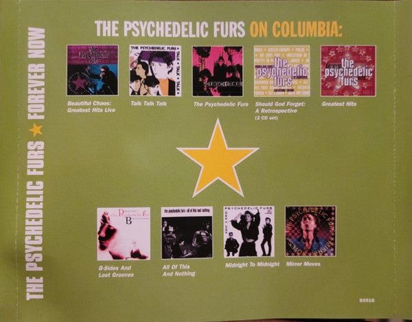 Written on backcover: 'With their creative prowees in high gear, the 1982 album Forever Now pushed the Furs over the cusp. Produced by legendary musician/producer Todd Rundgren, and driven by the anthem "Love My Way", Forever Now established the band as one of the lasting icons of their era. This package contains previously released material.' © 2002 Sony Music Entertainment Inc. / ℗ 2002 Sony Music Entertainment (UK) Ltd. Manufactured by Columbia Records. Mastered at Sony Music Studios, New York. Designed at Compression Studios. Tracks 1-10 taken from original 1982 album. Track 11 recorded 1982 - outtake from Forever Now sessions. Track 12 recorded 1982 - outtake from Forever Now sessions. Also B-side of UK single 'Love My Way'. Track 13 recorded 1982 - outtake from Forever Now sessions. Also B-side of US single 'Love My Way', B-side of UK single 'Danger'. Track 14 recorded 1982 - outtake from Forever Now sessions (previously unreleased version of 'Yes I Do'). Track 15 recorded 1982, B-side of US single 'Run And Run'. Track 16 recorded 1988, from the US Maxi-cassette 'All That Money Wants'. Digitally remastered re-issue of 1982 album, with essay in liner notes, rare photos, fully restored artwork and 6 bonus tracks. Cat No. appears as 'CK 85916' on the spines and disc label and as '85916' on the inside of the rear insert and the back page of the booklet.