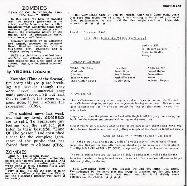 "Both sides of all fourteen singles released under the Zombies' name in the 1960s: a run of unparalleled quality and consistency in the annals of pop music. They are presented in mono as originally issued."