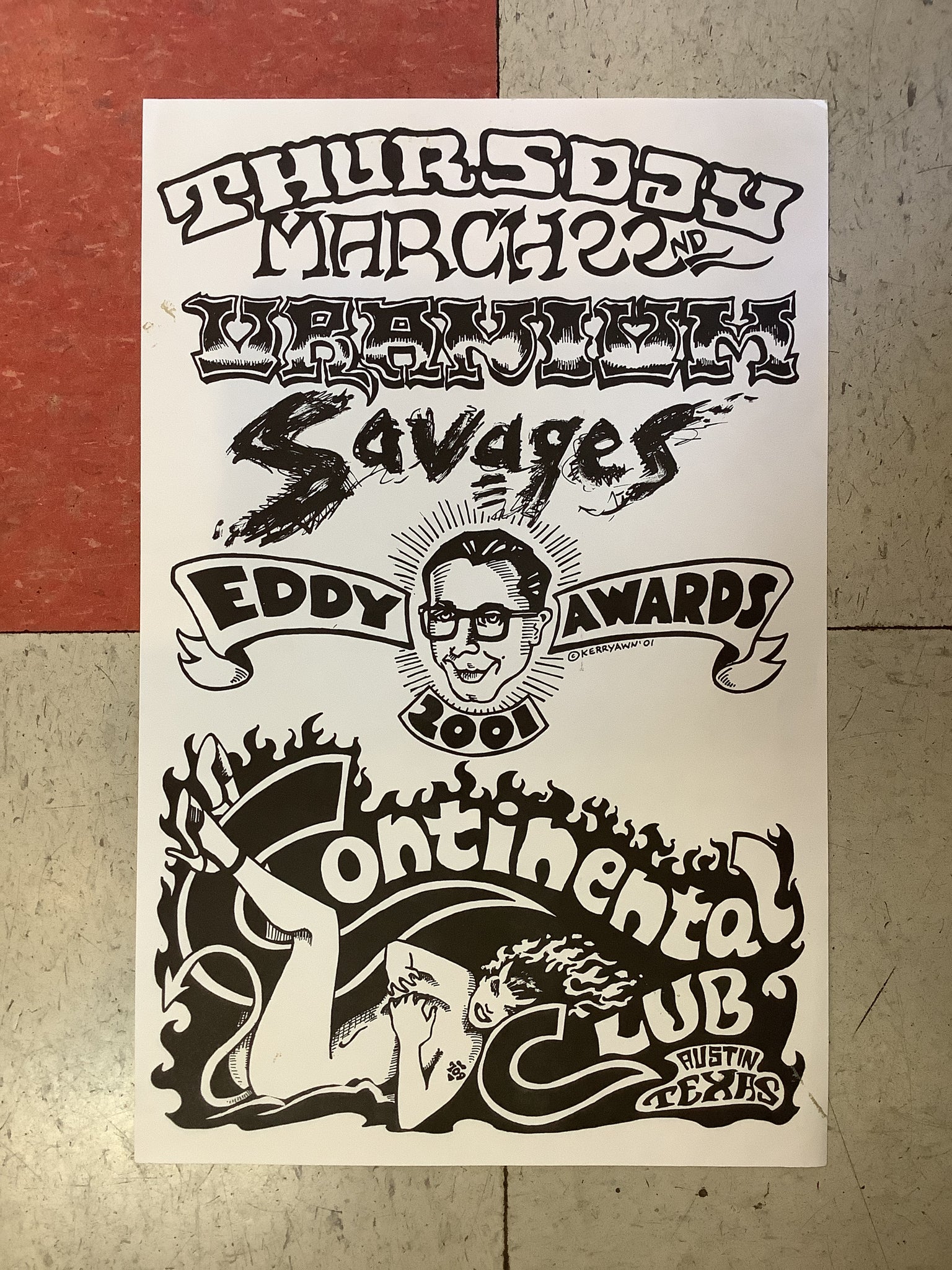 Poster by Kerry Awn promoting a show with Uranium Savages - Eddy Awards at Continental Club. March 22nd, 2001.