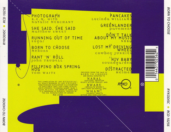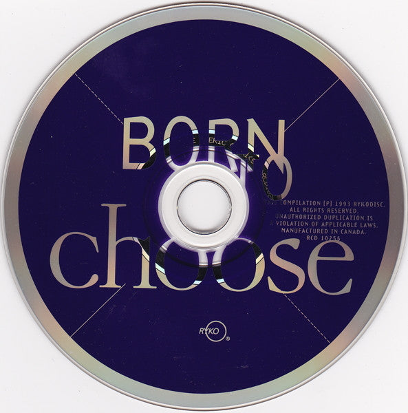 This compilation ℗ 1993 Rykodisc. All rights reserved. © 1993 Emigre. Printed in the USA. Manufactured in Canada. Proceeds from the sale of Born To Choose are being donated to Naral (National Abortion Rights Action League) and Bware (Brooklyn Women's Anti Rape Exchange) and Wham! (Women's Health Action and Mobilization).