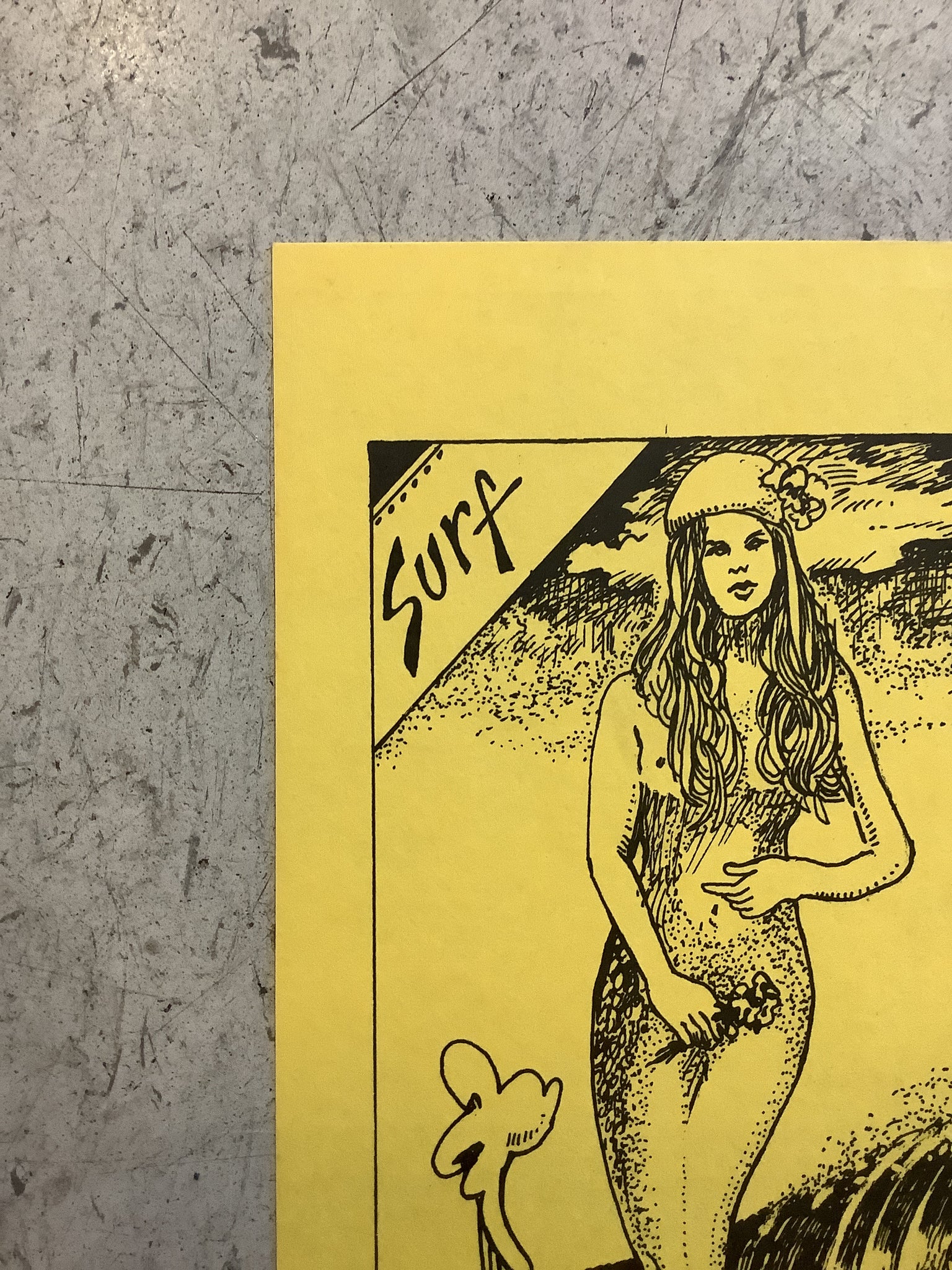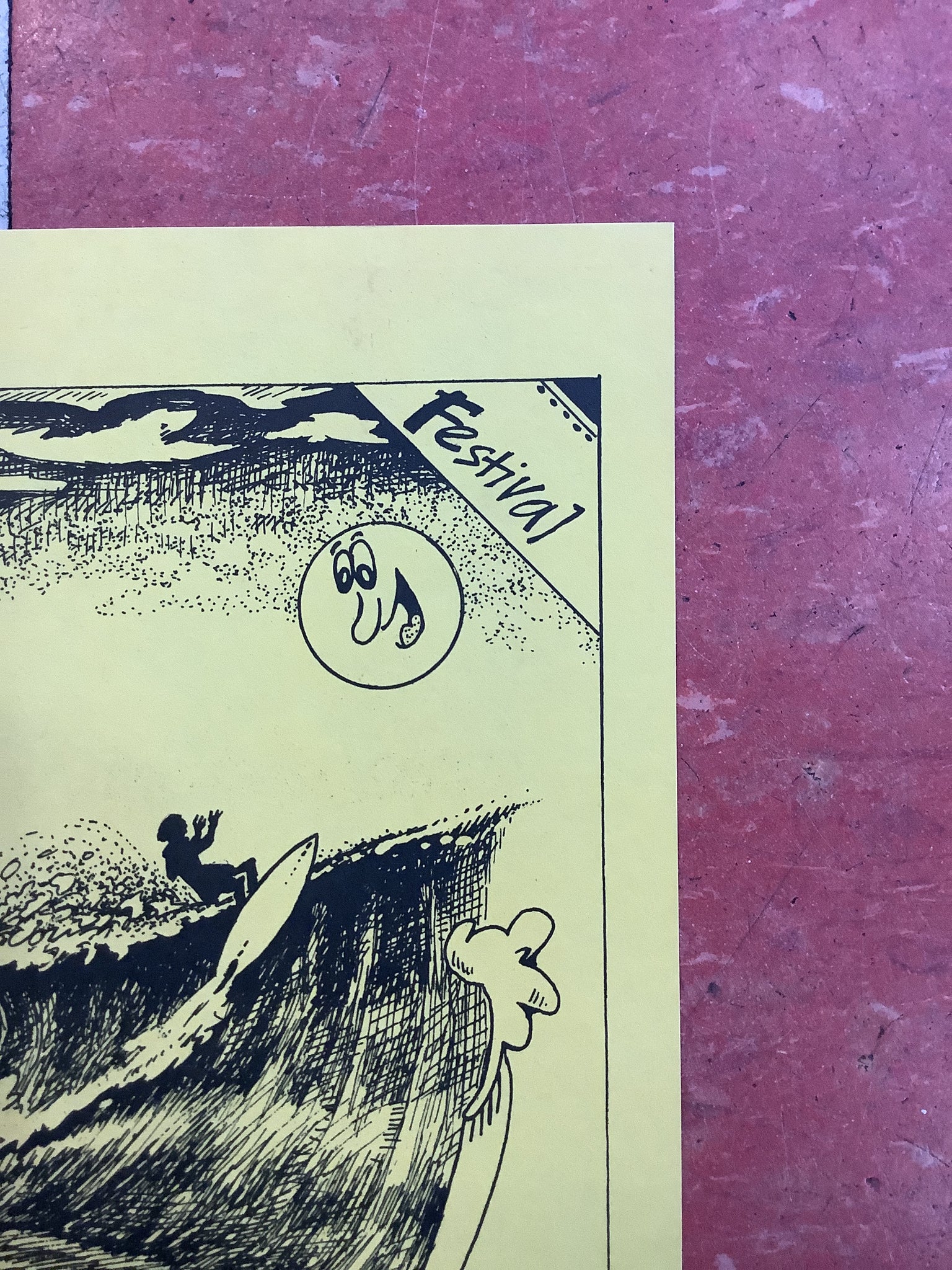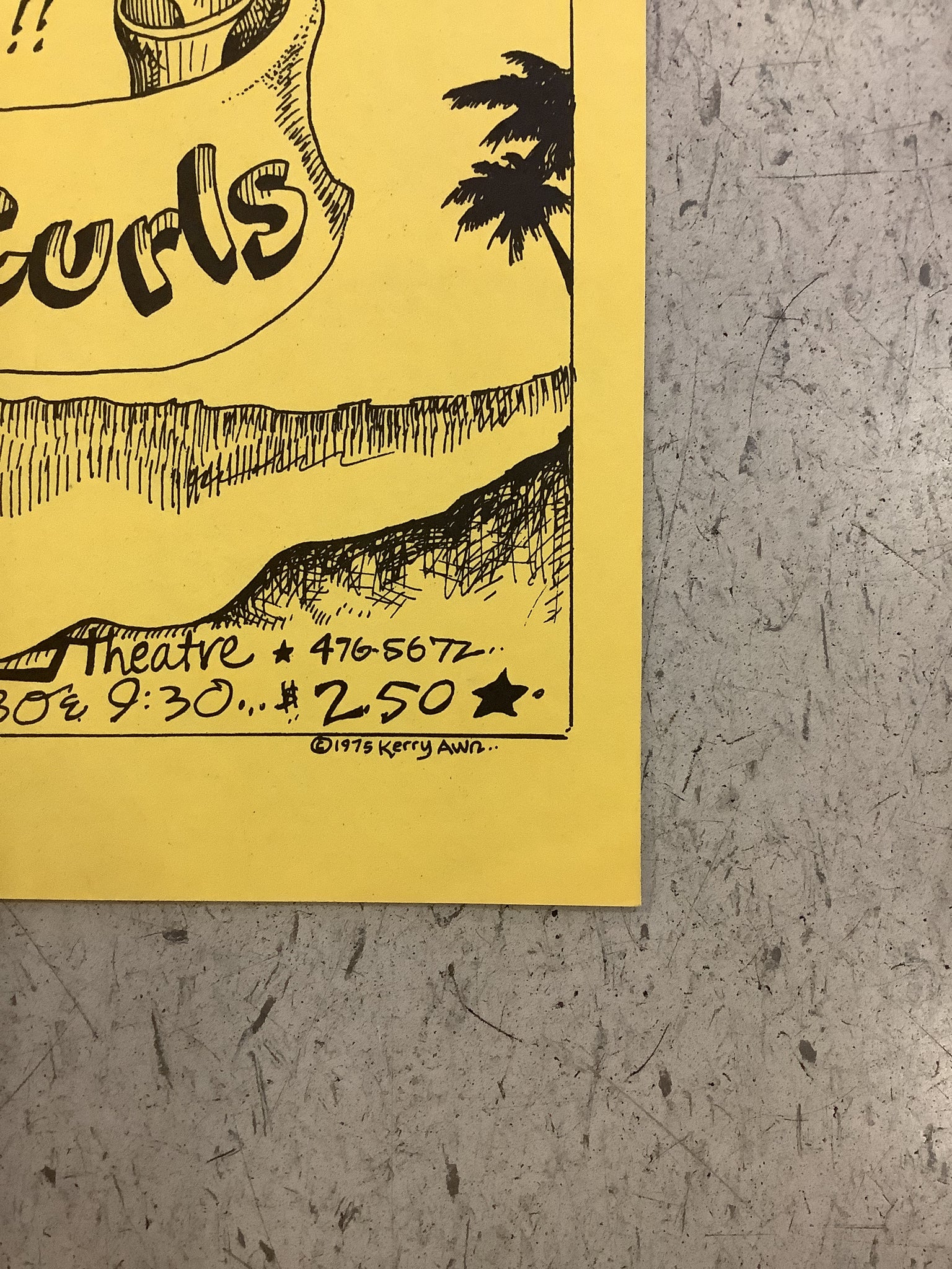 Vintage Austin Ritz Theatre poster designed by Kerry Awn. Promoting a surf festival and a performance by O.T. and the Hot Curls. March 7th, 1975.