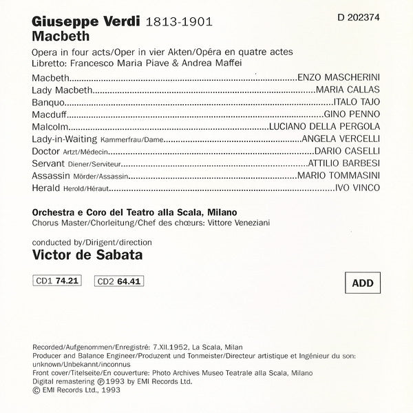 Club edition, no barcode. Comes with 60 page booklet in Italian and English with liner notes and translations of the lyrics in both languages. D 202374 Mfd. for BMG Direct Marketing, Inc. under License 6550 East 30th Street, Indianapolis, Indiana 46219 Recorded: 7.XII.1952, La Scala, Milan CD1 74.21 CD2 64.41 MONO ADD Producer and Balance Engineer: Unknown Front cover: Photo Archives Museo Teatrale alla Scala, Milano Digital remastering ℗ 1993 by EMI Records Ltd. © 1993 by EMI Records Ltd. Printed in The USA