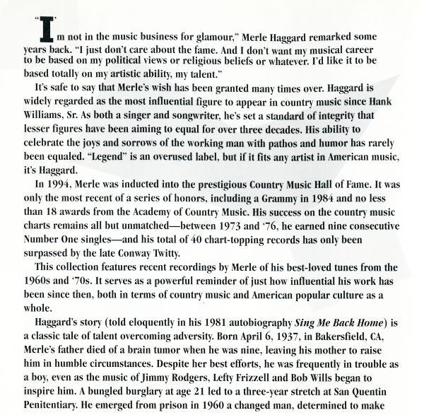 [Rear cover: © & ℗ 1995 Curb Records, Inc. [... Printed in USA. [Liner notes: This collection features recent recordings by Merle of his best loved tunes from the 1960s and 70s. ℗ 1994, 1995 Tree Productions, Inc.