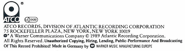 © 1989 Atlantic Recording Corporation Made in Germany. Jewel case. Circa 1990s reissue.