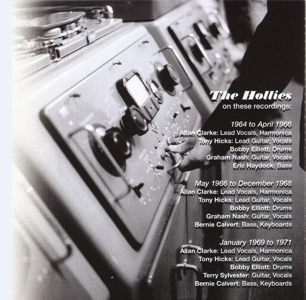 "This Hollies release presents for the first time, BBC live session recordings made between 1964-1971. This CD contains 32 previously unreleased tracks taken from numerous shows including ‘Saturday Club’, ‘Top Gear radio show’ and ‘Top of The Pops’ TV show, and features the hits ‘I’m Alive’, ‘Here I Go Again’, ‘I Can’t Let Go’ and ‘He Ain’t Heavy, He's My Brother’. The sleeve notes have been written by drummer, Bobby Elliott, and provide a humorous insight into the recording sessions, and convey the exciting times of The Hollies at their peak"