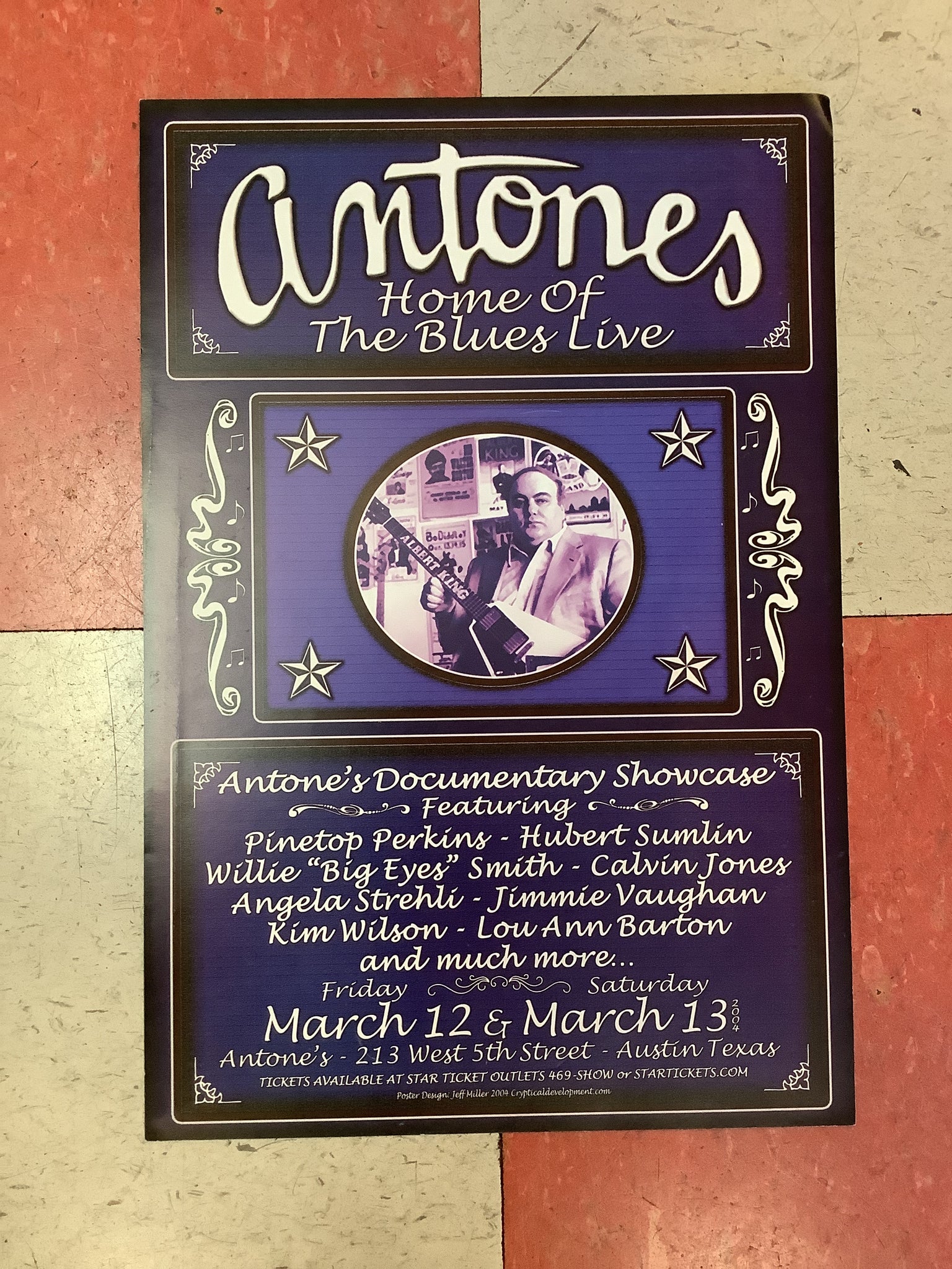 Poster from the Antone's documentary showcase. Performances by Pinetop Perkins, Hubert Sumlin, Willie "Big Eyes" Smith, Calvin Jones, Angela Strehli, Jimmie Vaughan, Kim Wilson, Lou Ann Barton... March 12 & 13 2004. Designed by Jeff Miller.