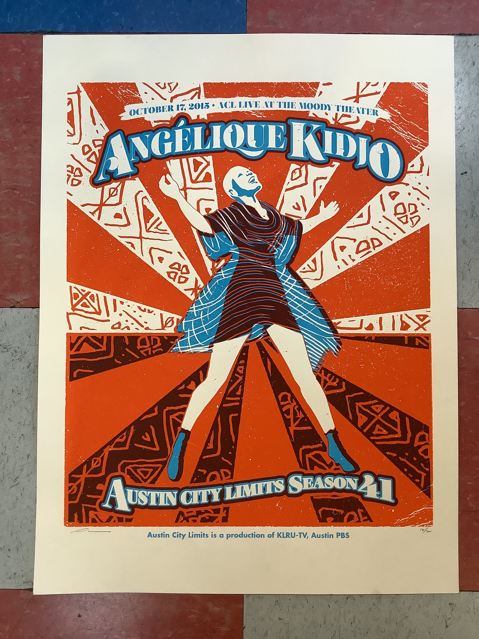 Original poster from Angélique Kidjo's appearance on Austin City Limits, Season 41. Taped on October 17th, 2015. Designed and hand signed by Andy Vastagh. Numbered 58/200.