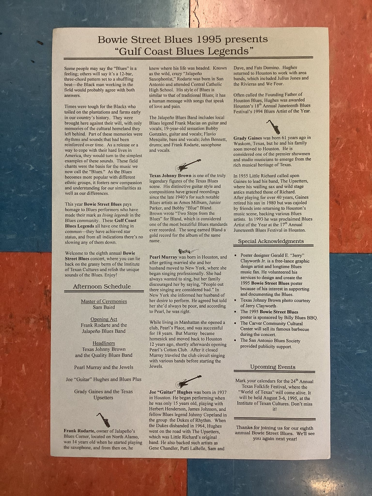 Poster from Bowie Street Blues featuring Joe "Guitar" Hughes, Grady Gaines, Pearl Murray, and Texas Johnny Brown on April 30th, 1995. Designed by Jerry Clayworth. Two sided.