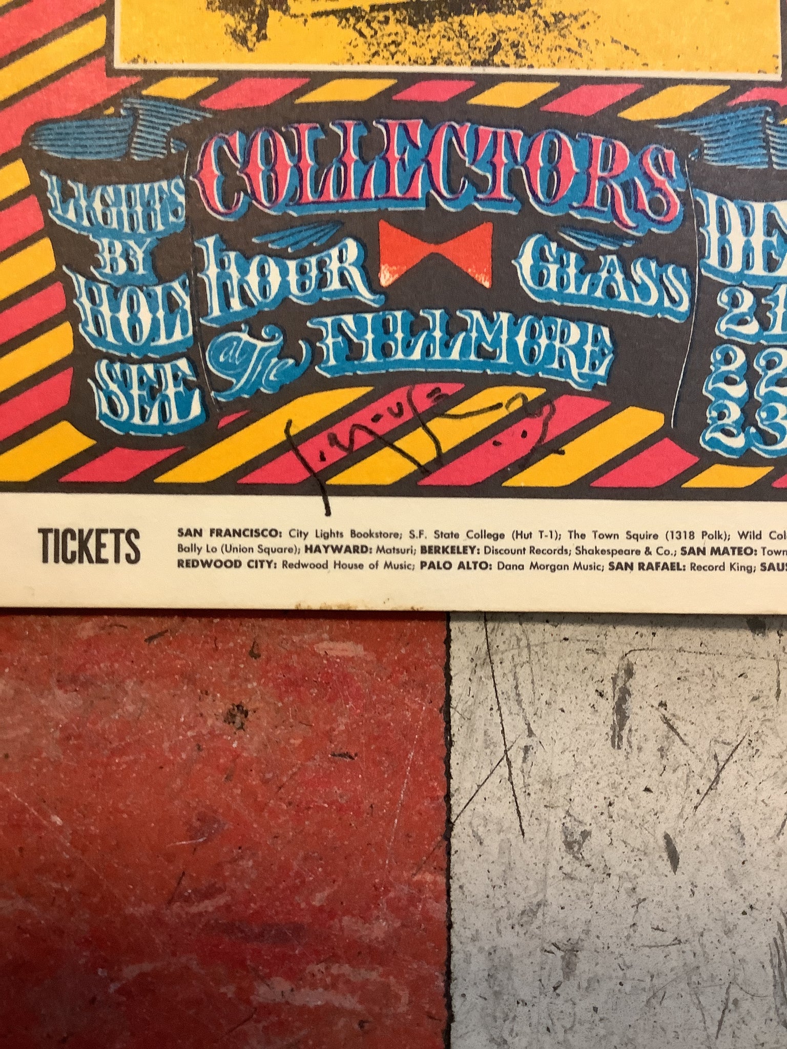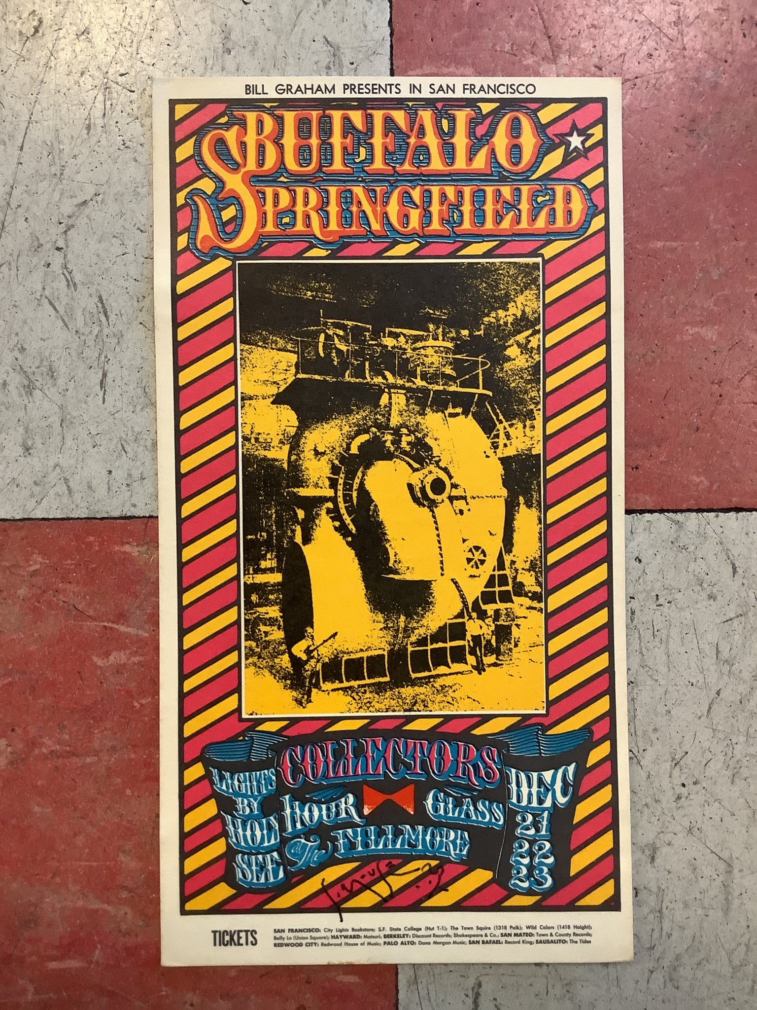 Vintage postcard advertising Buffalo Springfield's show with Collectors and Hour Glass at The Fillmore on December 21, 22, & 23 in 1967. Designed by Alton Kelley and Stanley Mouse. Hand-signed by Mouse.