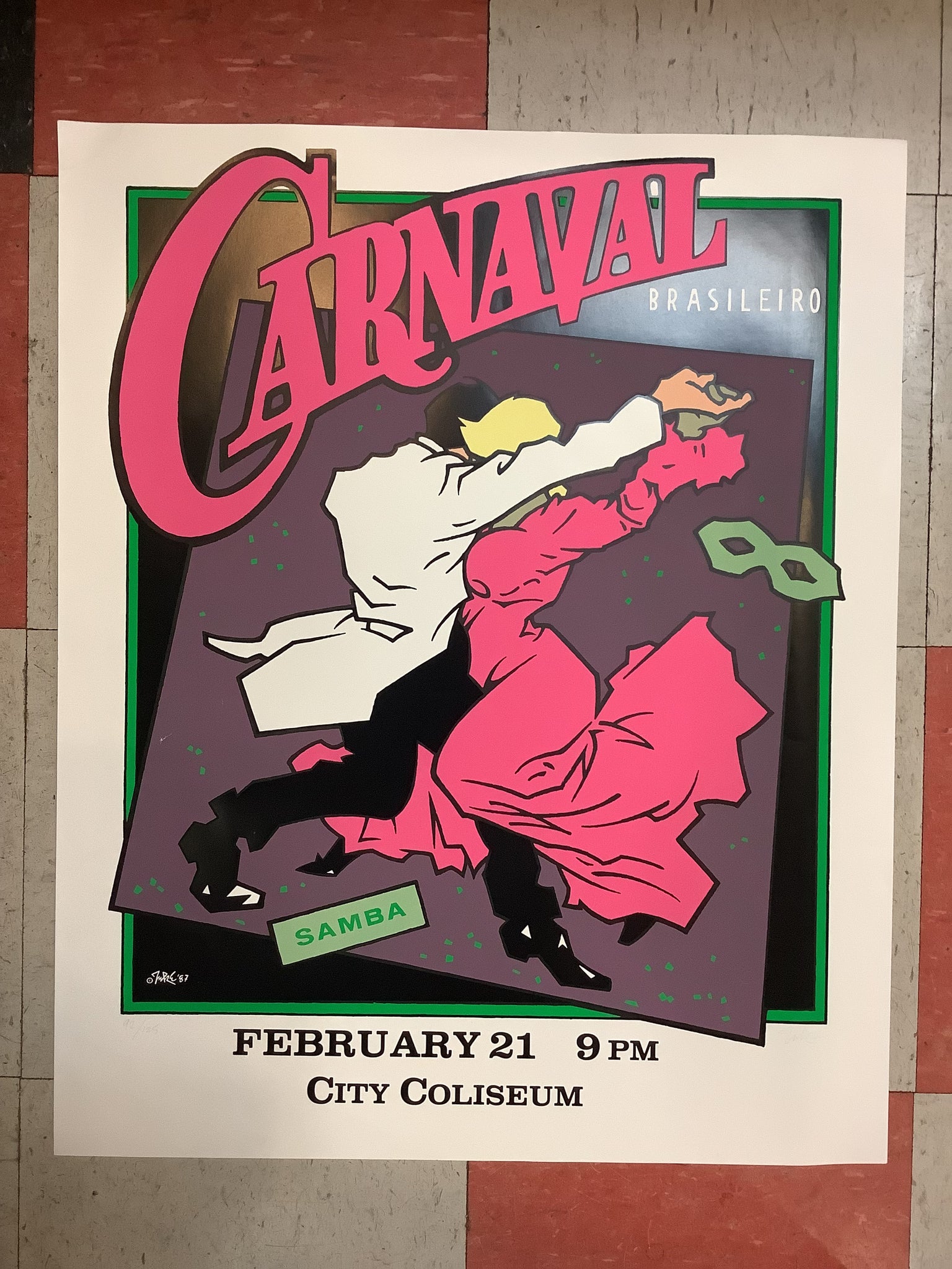 Poster from Carnaval at City Coliseum on February 21st, 1987. Designed/hand-signed by Guy Juke. Hand numbered 92/125.
