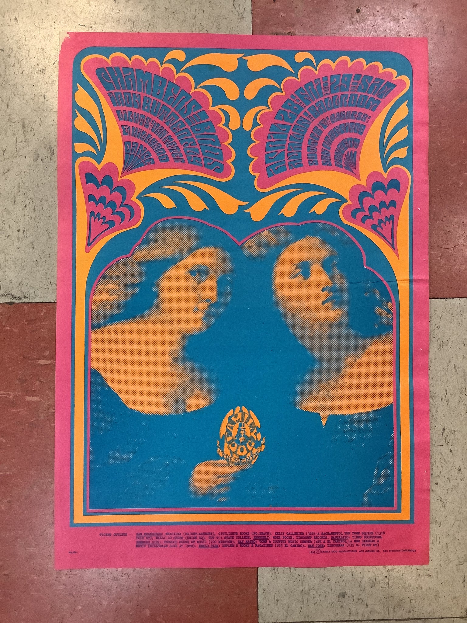 Vintage poster (1st pressing) promoting shows with Chambers Brothers and Iron Butterfly at Avalon Ballroom in April of 1967. Designed by Victor Moscoso. A Family Dog Productions show. "20" written in pencil on the back.