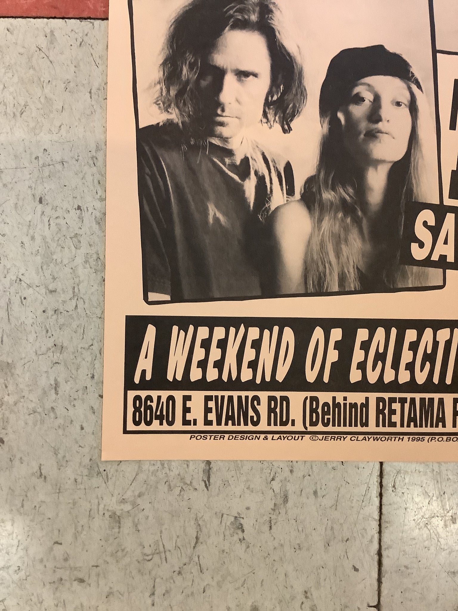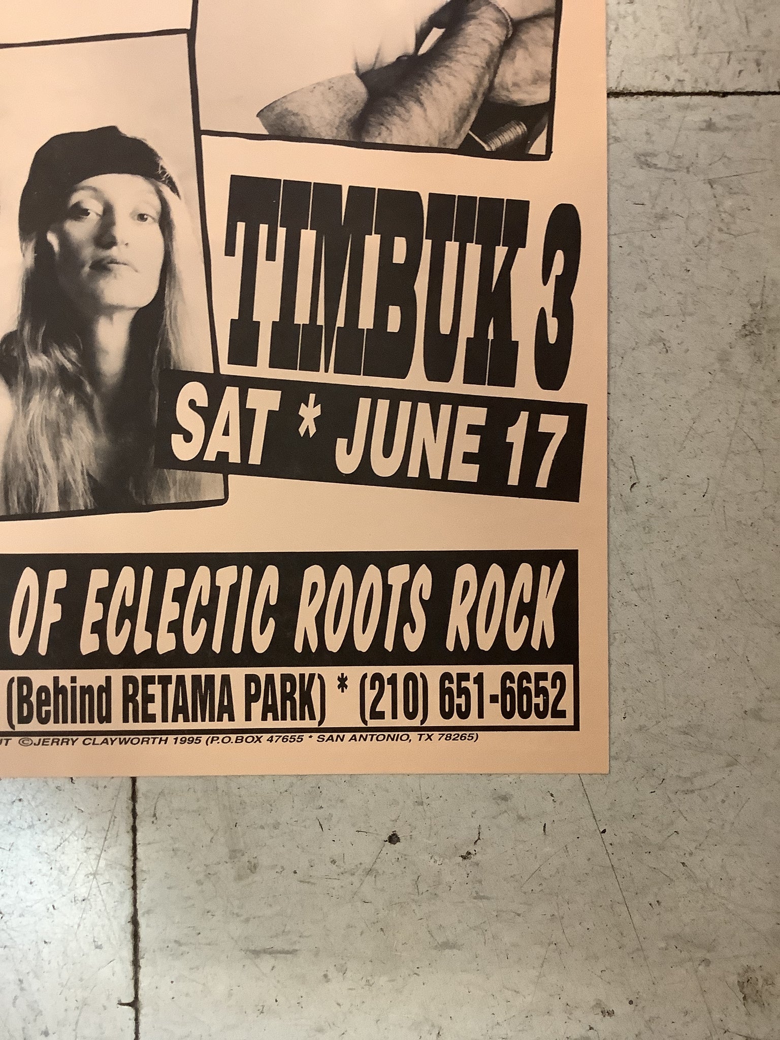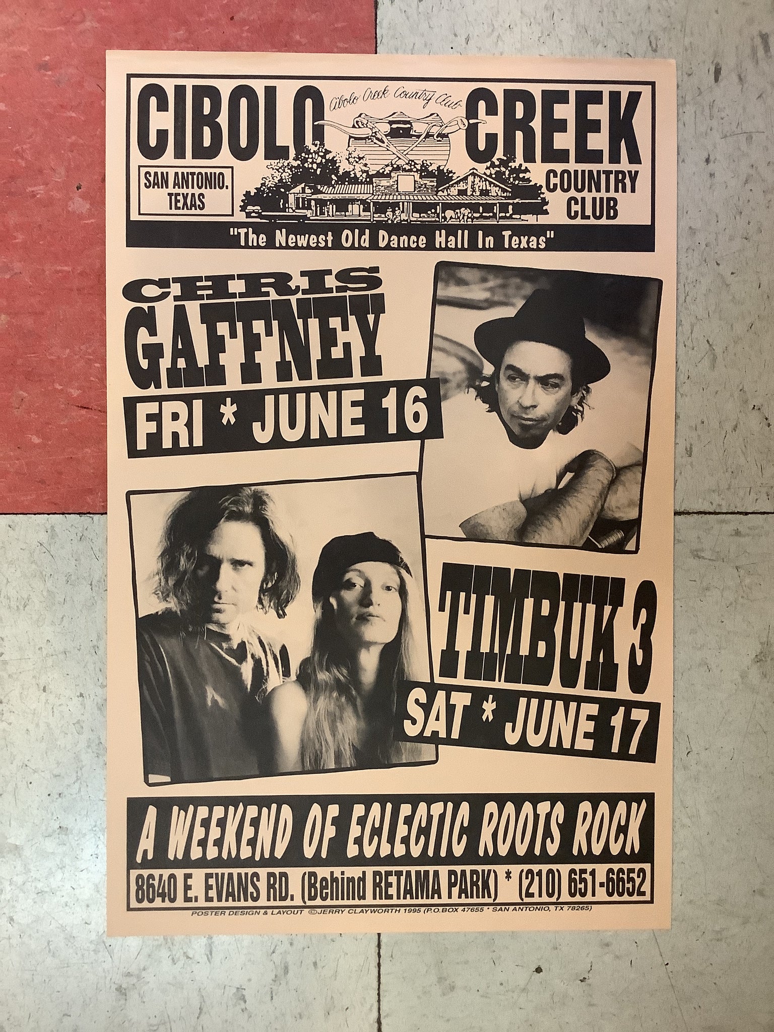 Poster promoting shows with Chris Gaffney and Timbuk 3 on June 16 and 17 1995 at Cibolo Creek Country Club in San Antonio, TX. Designed by Jerry Clayworth.