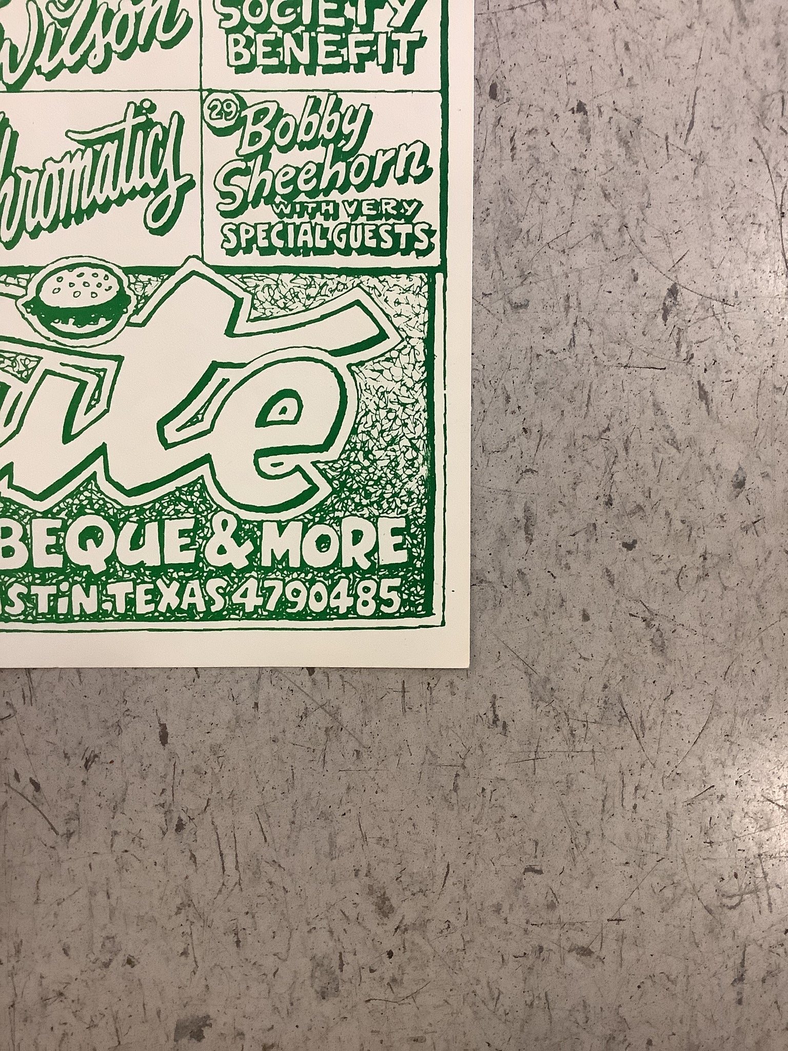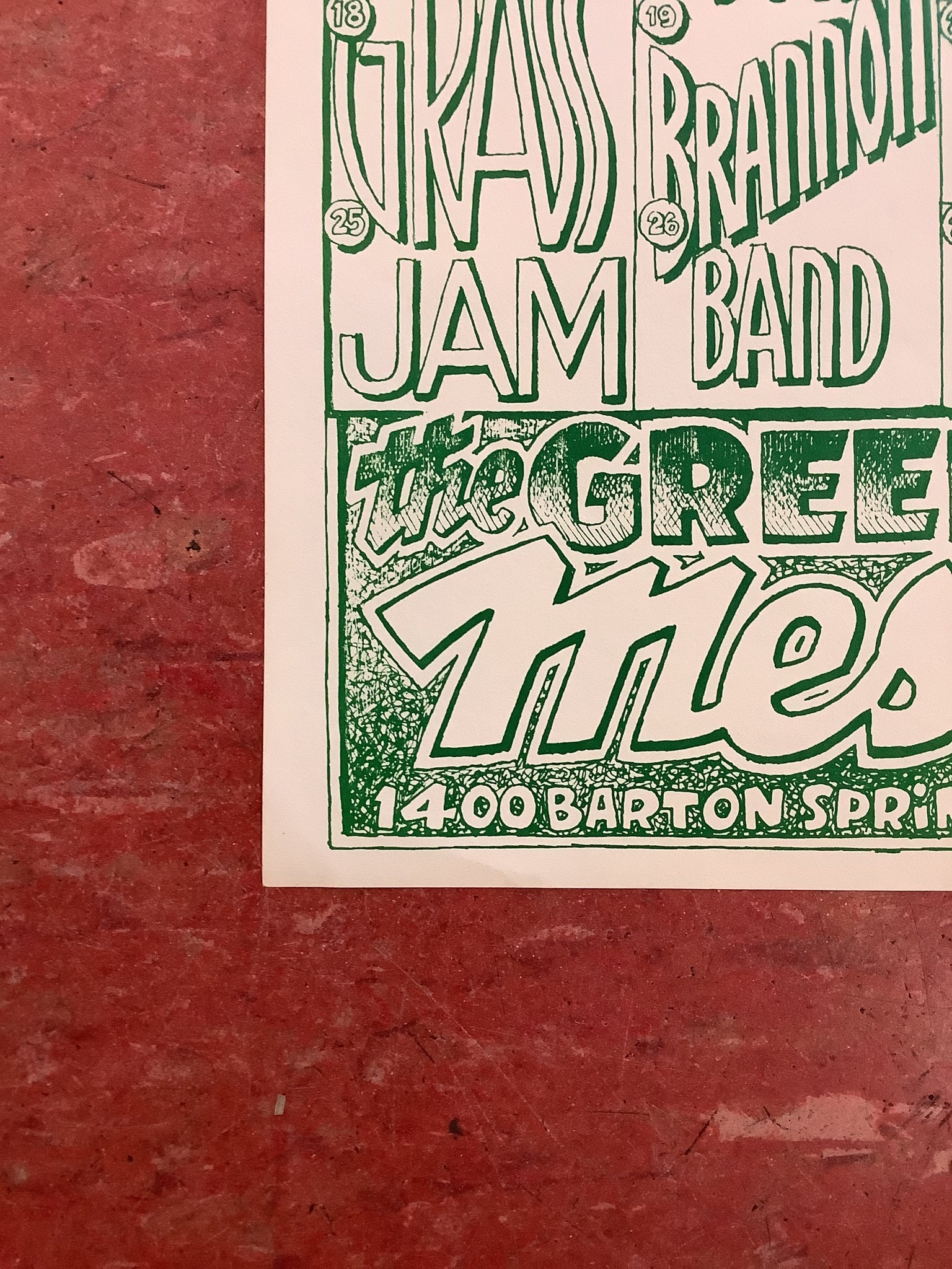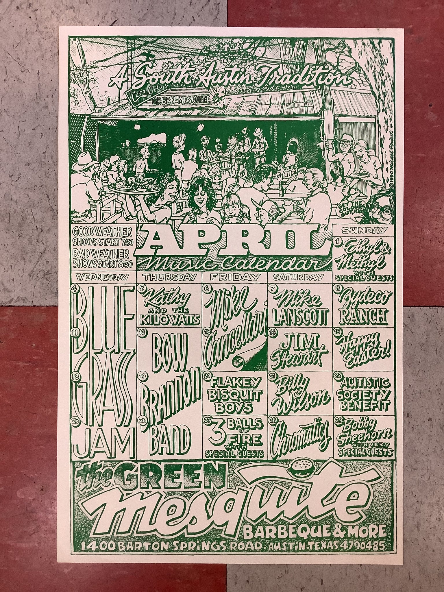 Vintage Micael Priest poster promoting a month of shows at The Green Mesquite in April 1990. Performers included Kathy and the Kilowatts, Bow Brannon Band, 3 Balls of Fire, Chromatics, and more!