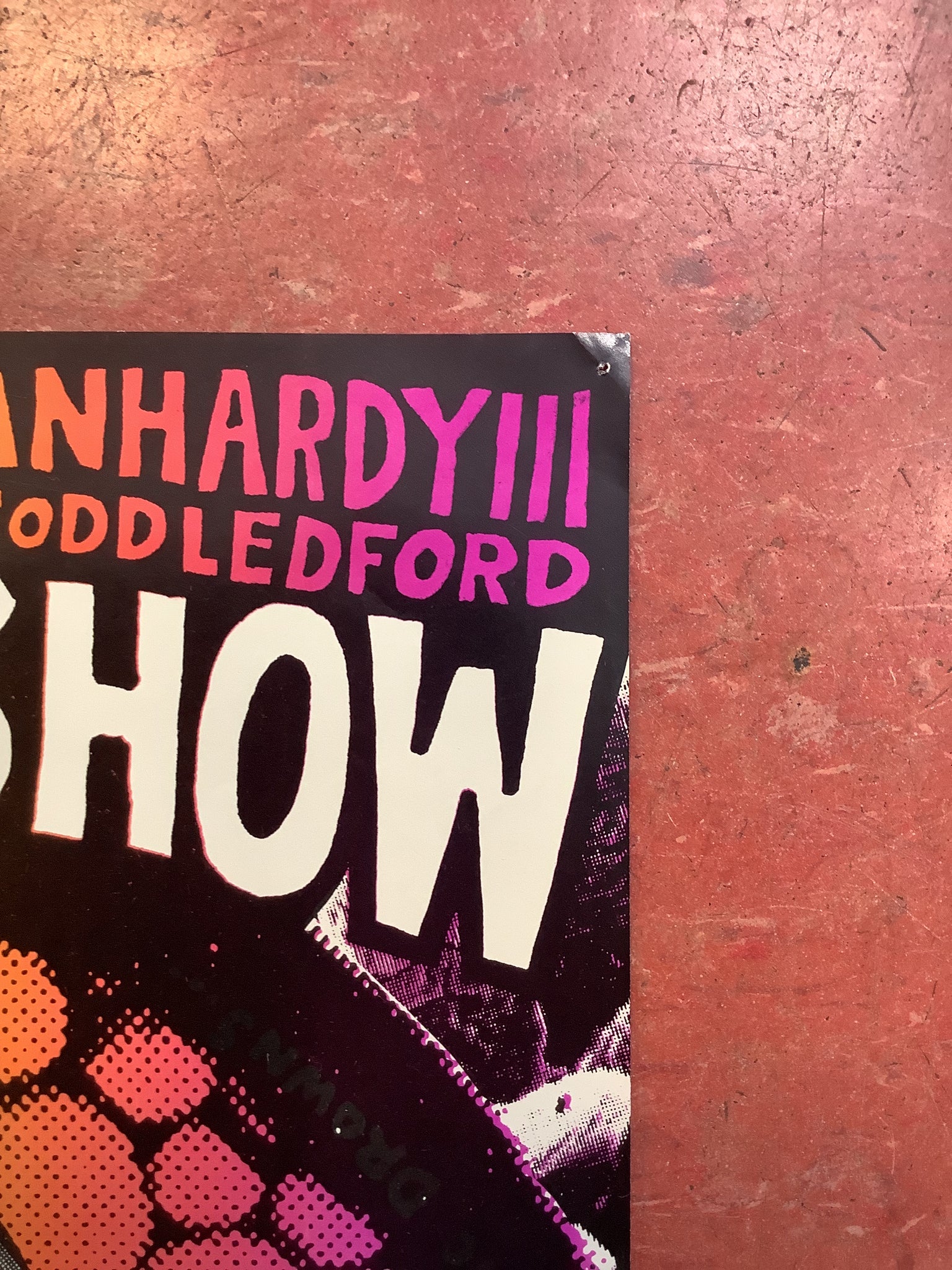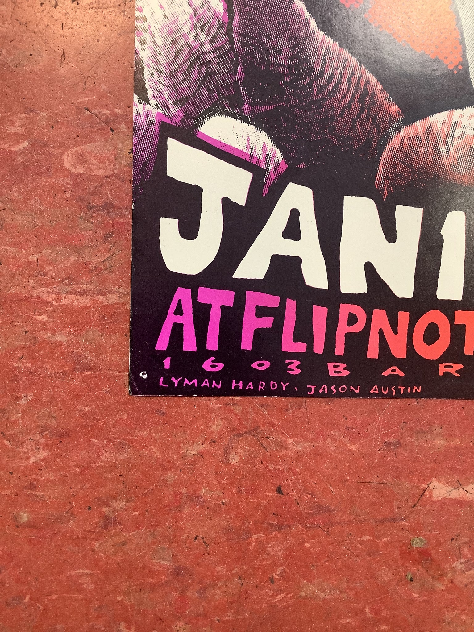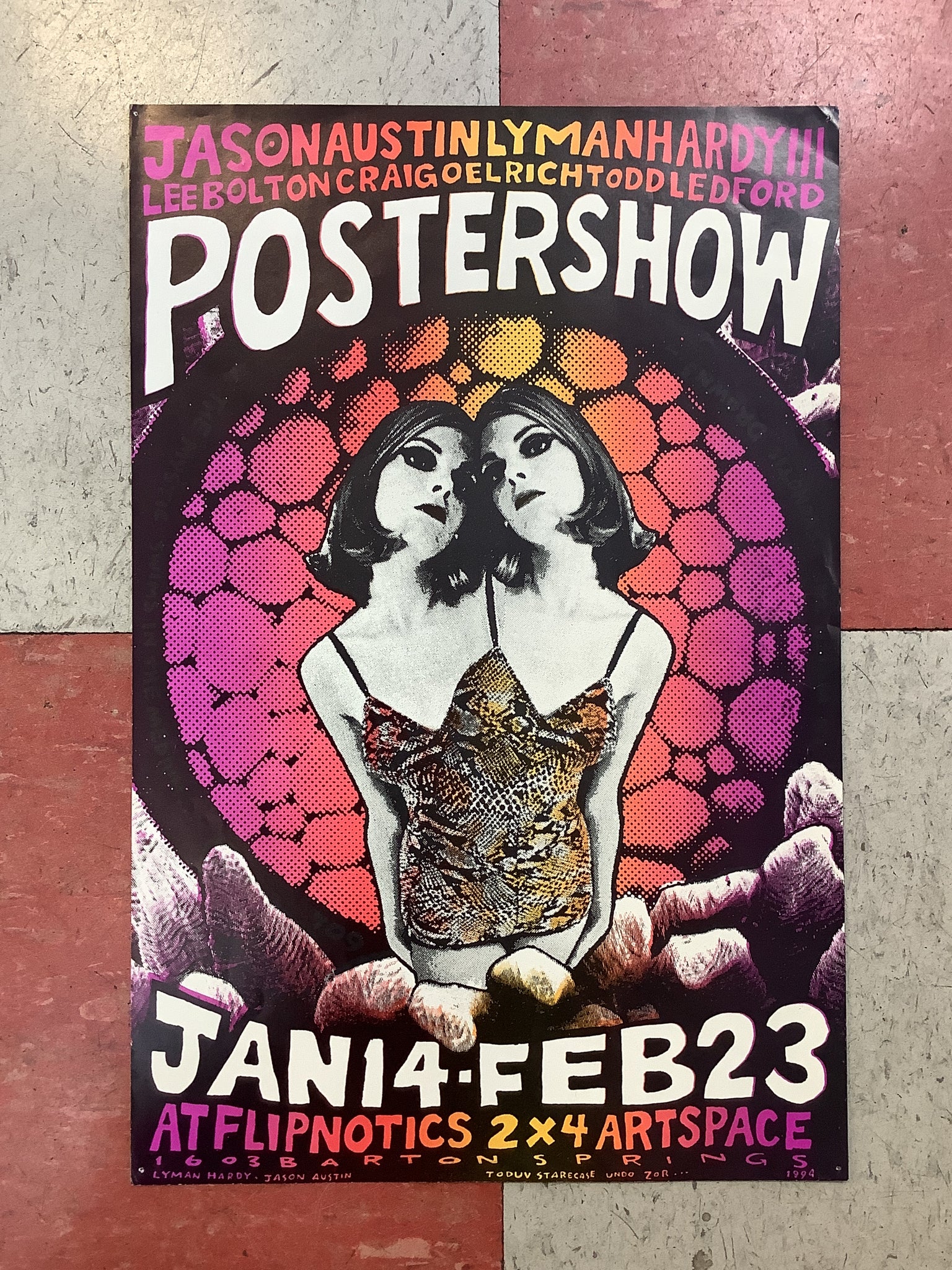 Vintage poster promoting a poster show featuring the artwork of Jason Austin, Lyman Hardy III, Lee Bolton, Craig Oelrich, and Todd Ledford. At Flipnotics 2x4 Artspace.