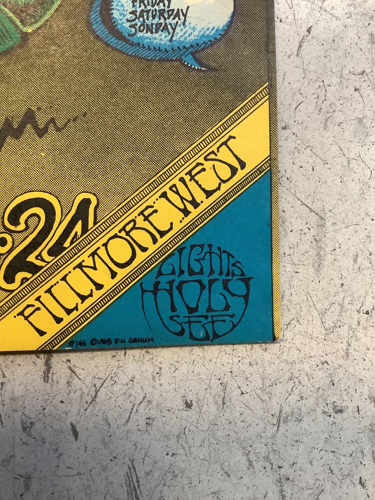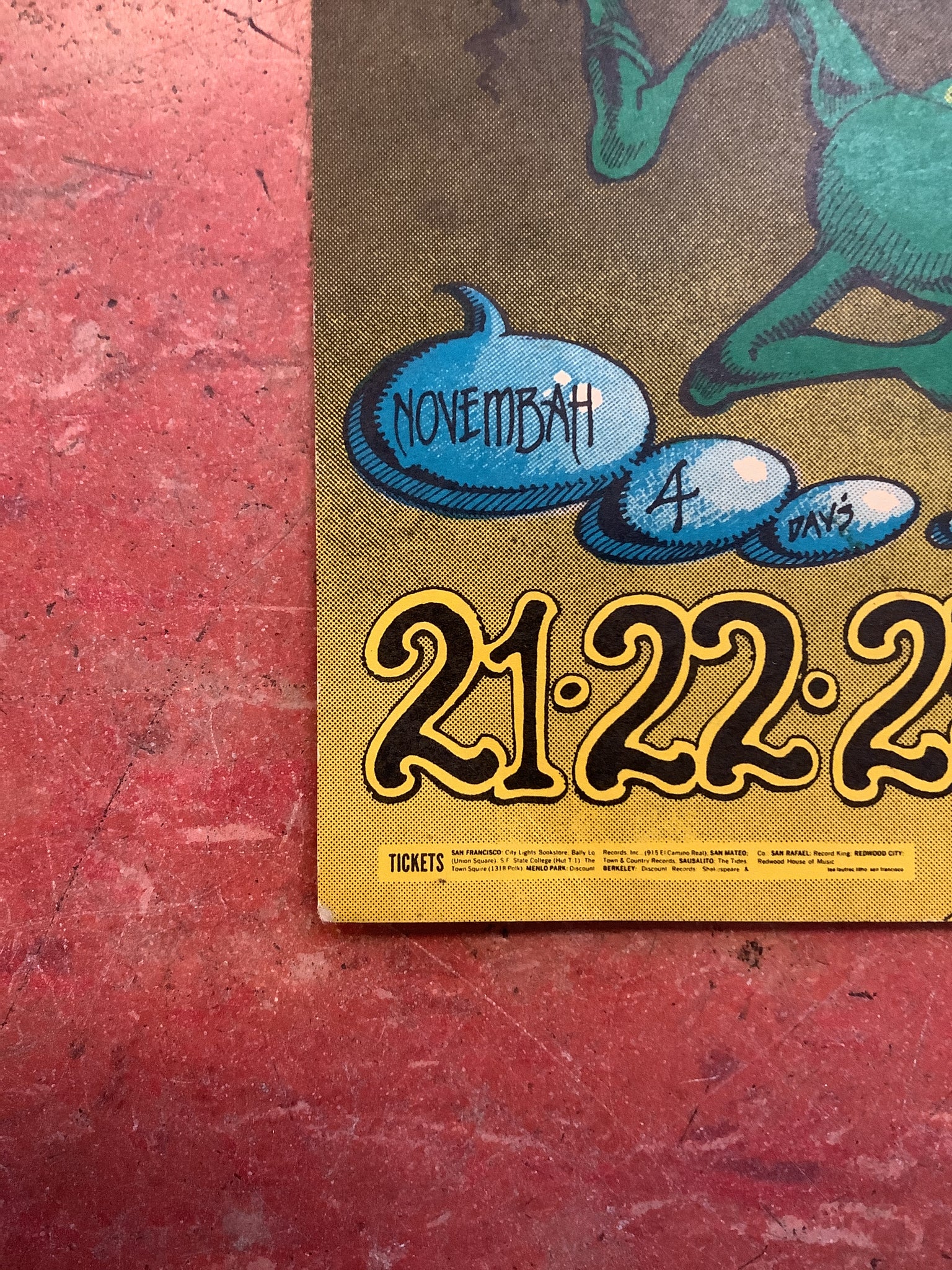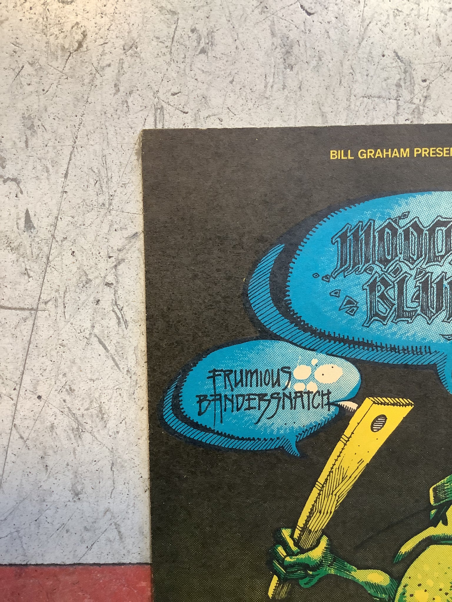 Vintage postcard promoting shows with Moody Blues, Chicago Transit Authority, and Frumious Bandersnatch at Fillmore West on November 21, 22, 23, & 24 in 1968. Designed by Rick Griffin & Alton Kelley.