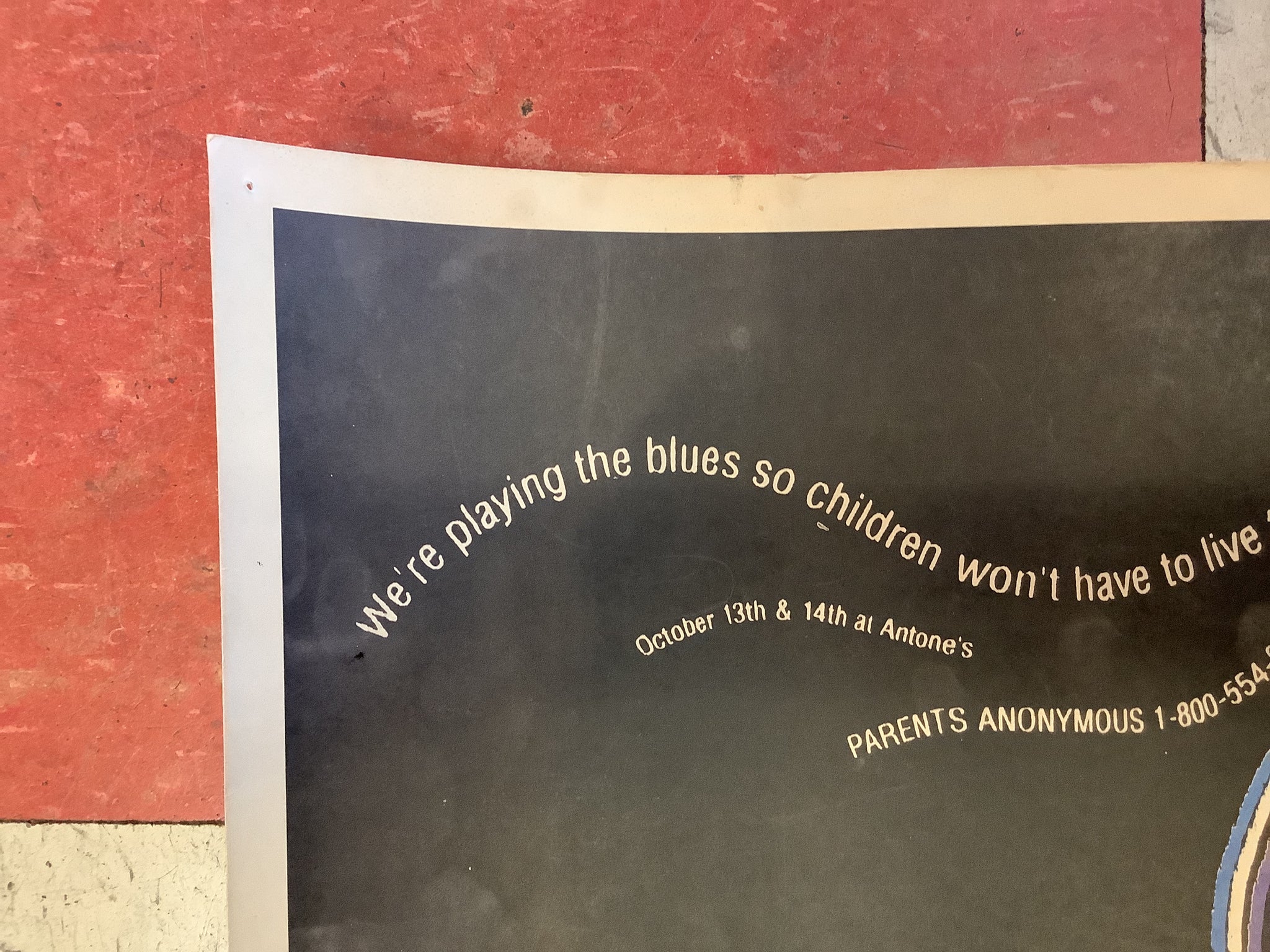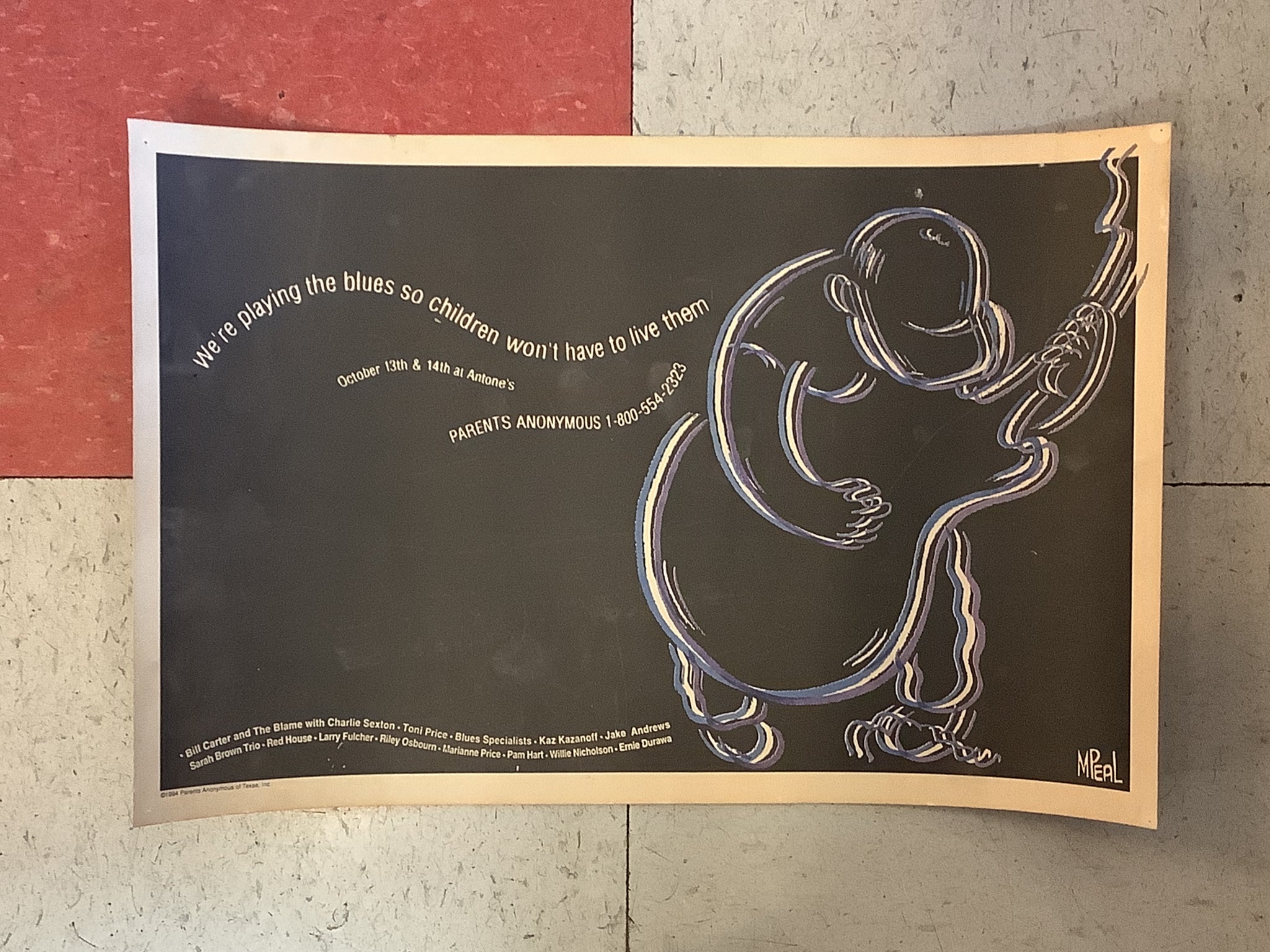 Vintage poster from the Parents Anonymous event at Antone's Nightclub on October 13&14, 1994. Performers included Bill Carter & The Blame with Charlie Sexton, Toni Price, and more. Designed by M Peal.