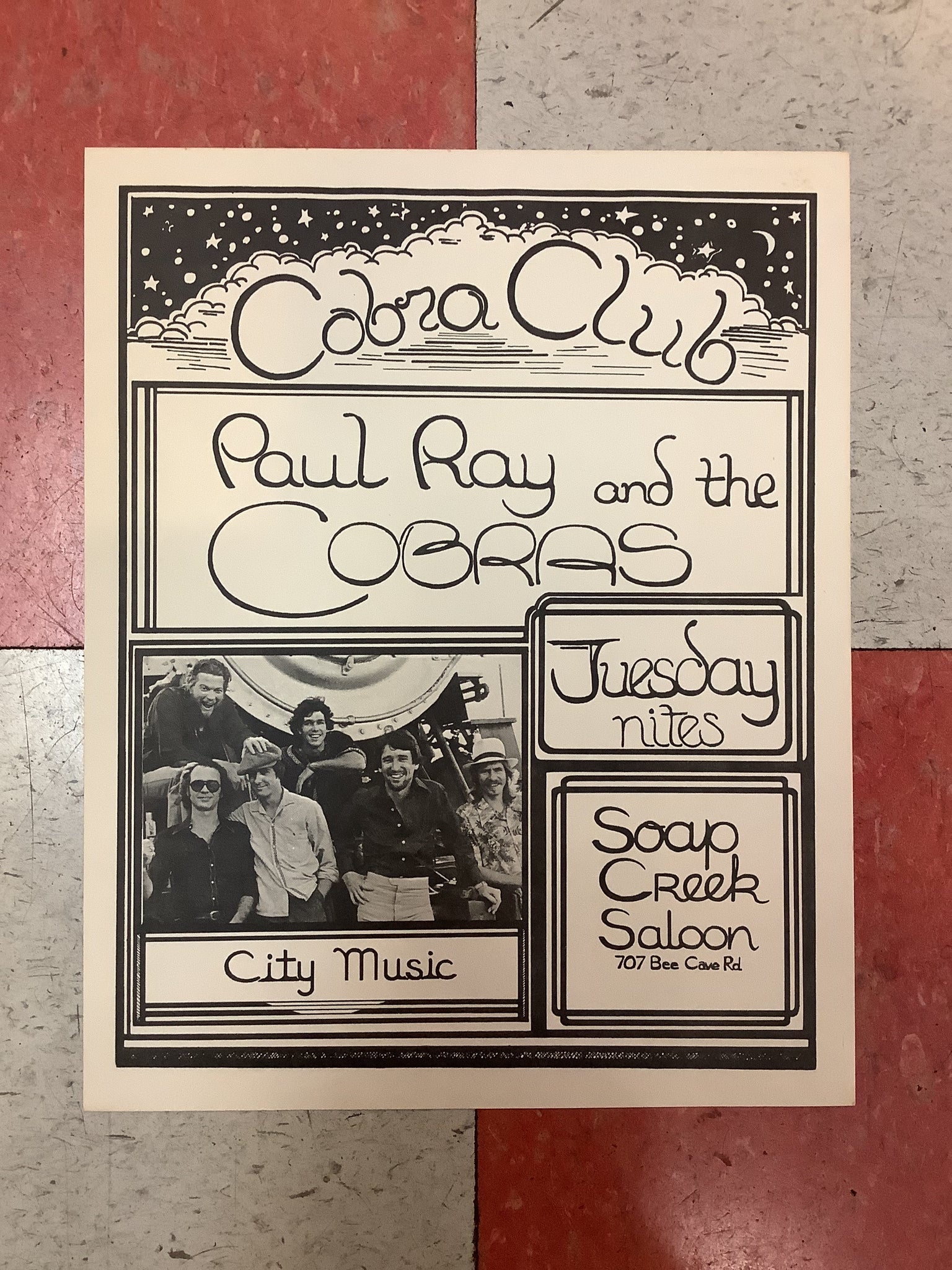 Vintage Paul Ray and The Cobras, Cobra Club, poster promoting their residency at Soap Creek Saloon. Exact year/poster artist unknown.