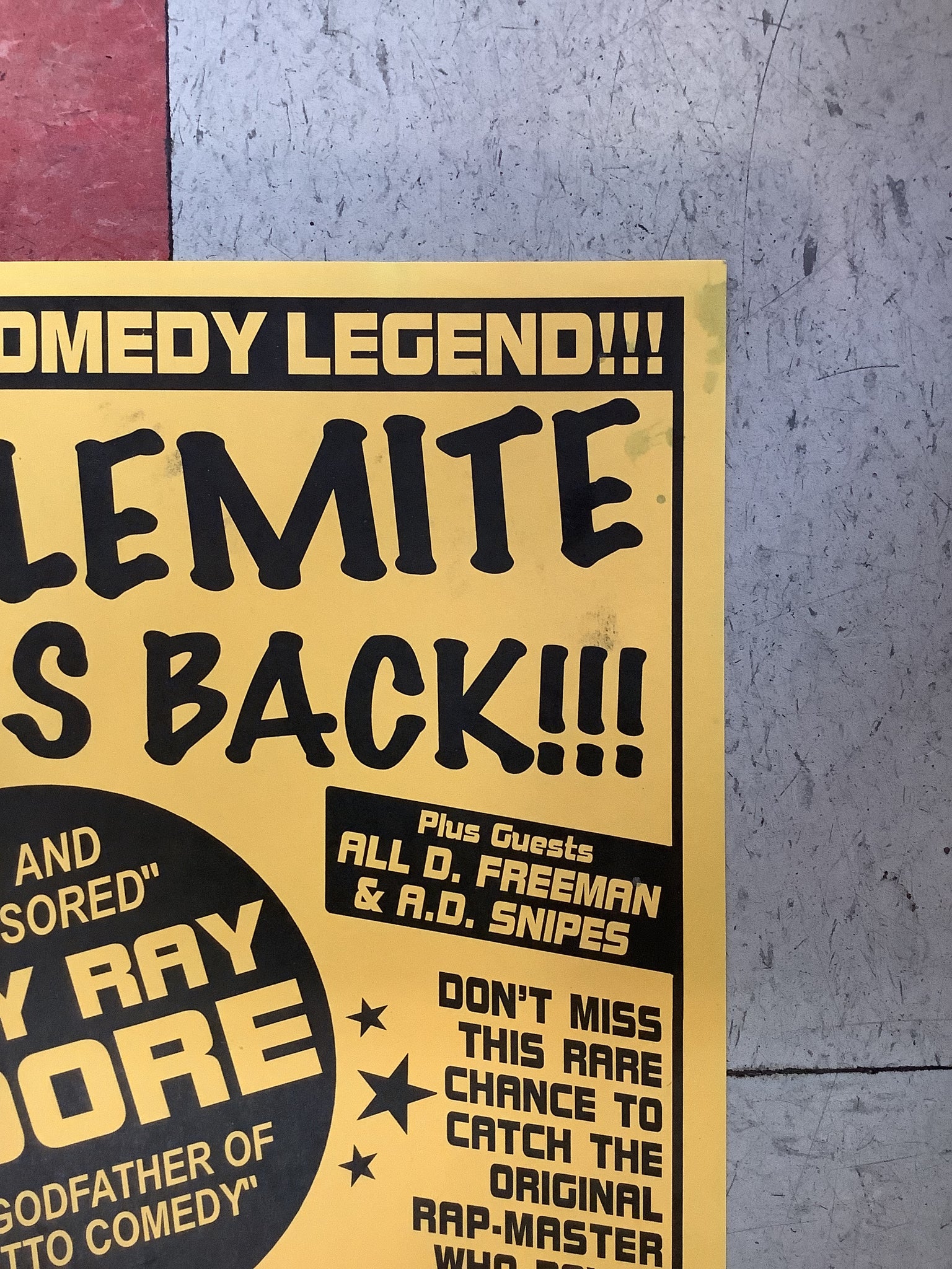 "Dolemite is Back" Rudy Ray Moore poster from his show at Carver Center in San Antonio, TX with All D. Freeman and A.D. Snipes on August 23rd, 1997. Designed by Jerry Clayworth.