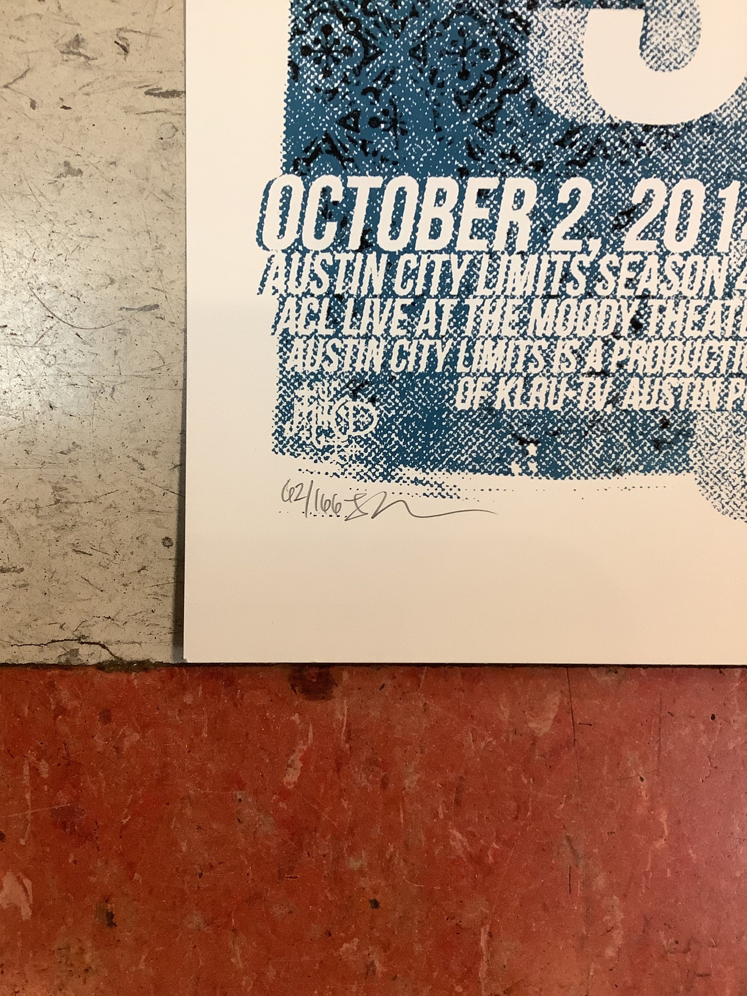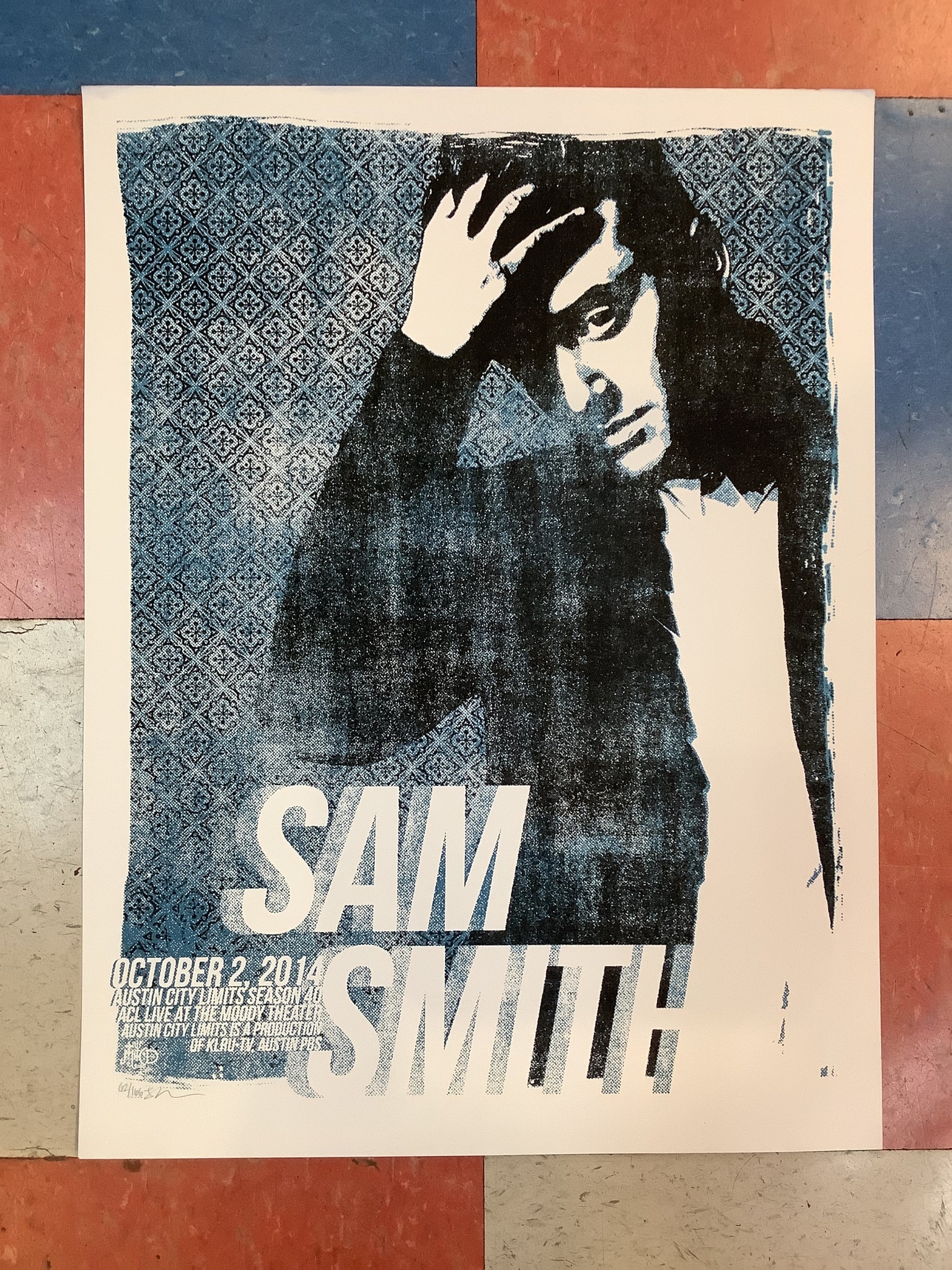 Original poster from Sam Smith's appearance on Austin City Limits, Season 40. Taped on October 2nd, 2014. Hand signed and numbered by poster artist. 62/166.