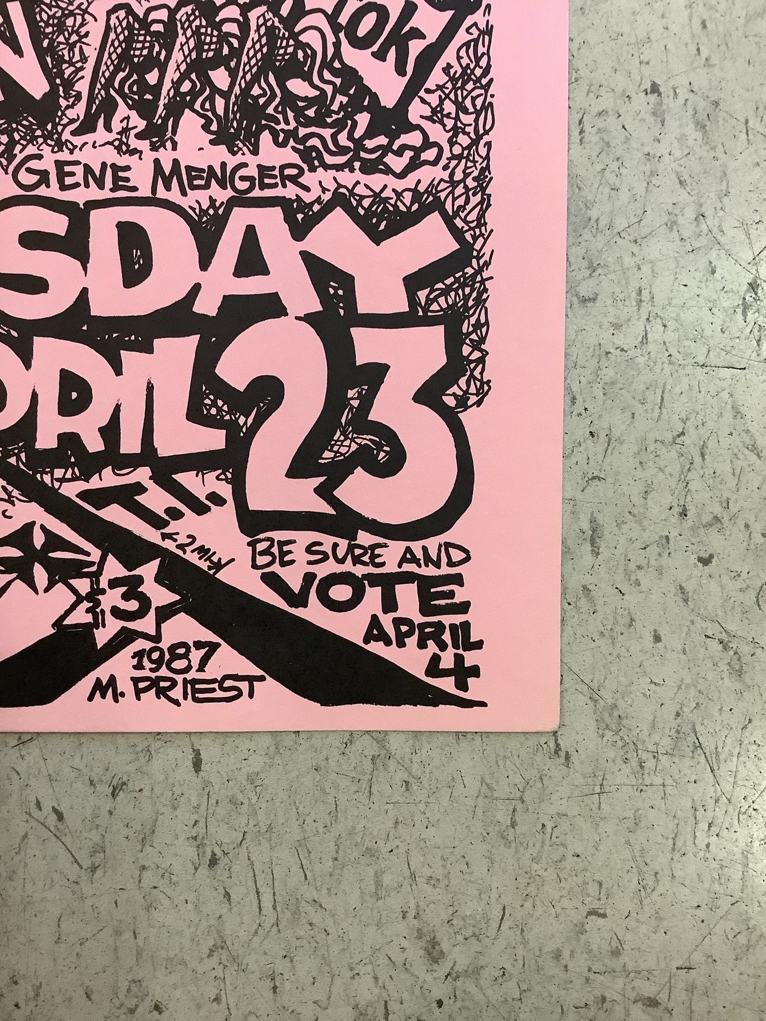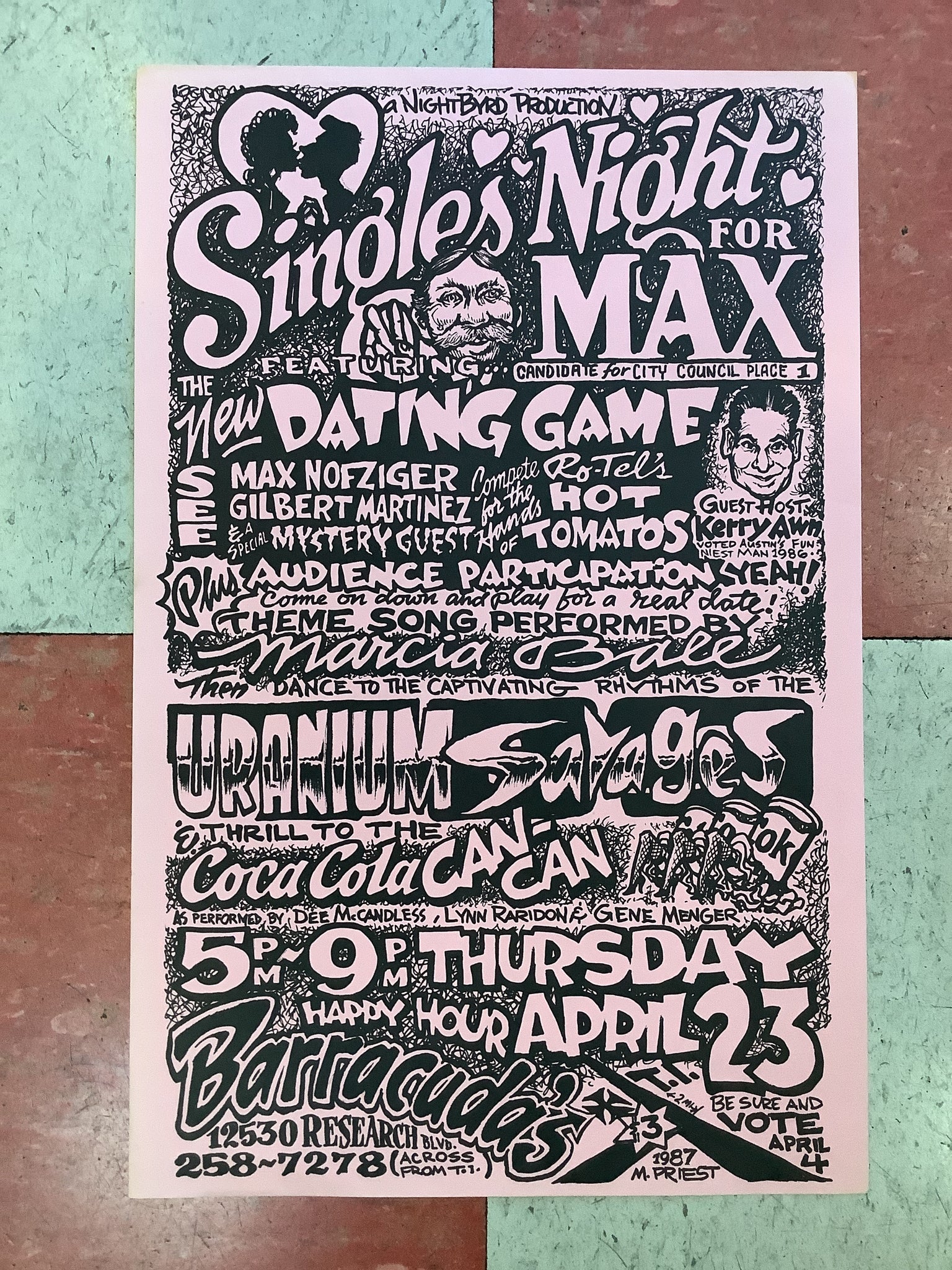 Vintage poster designed by Micael Priest. Performances by Marcia Ball, Uranium Savages, and more. Hosted by Kerry Awn. April 23rd, 1987.