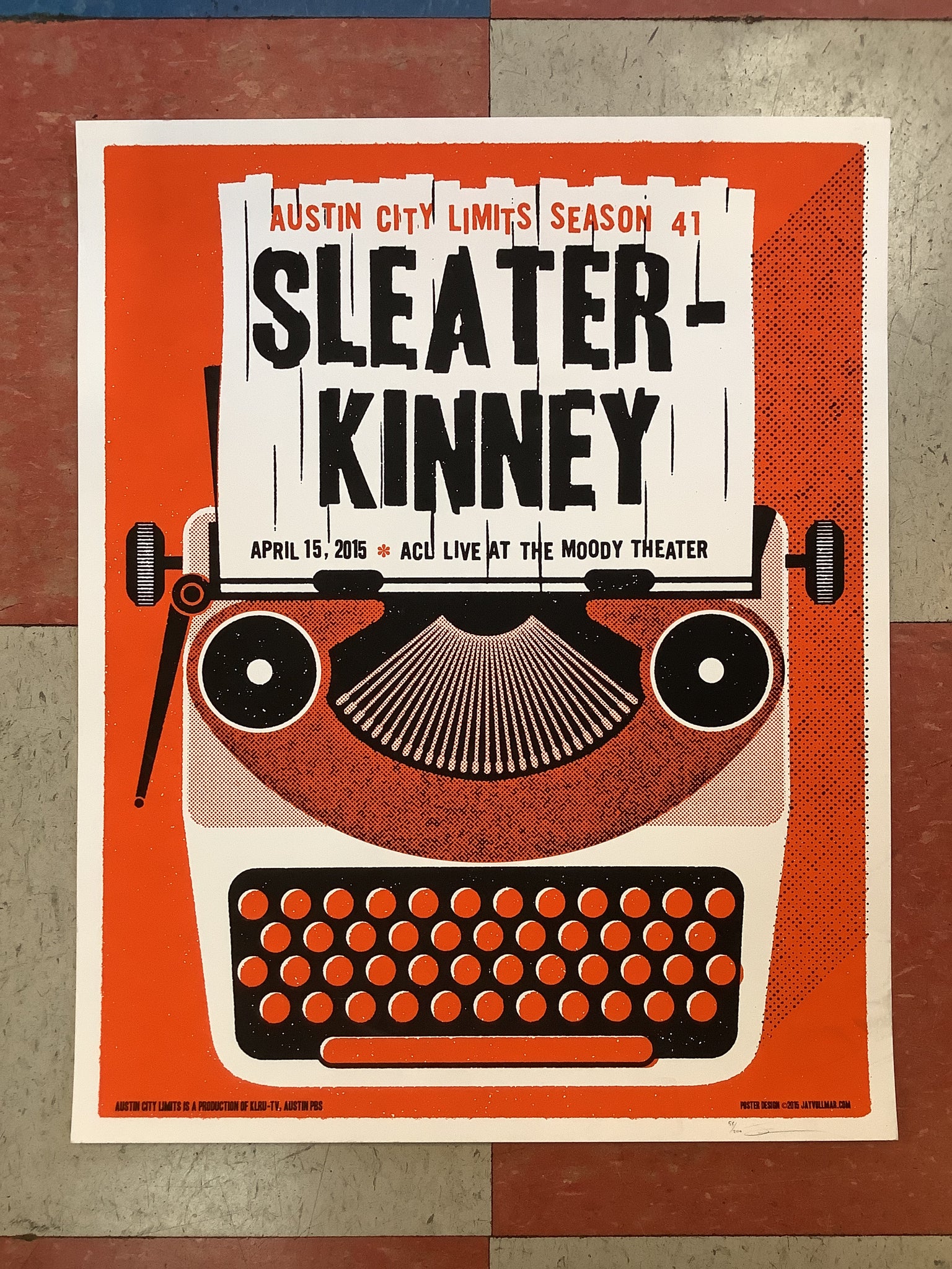 Original poster from Sleater-Kinney's appearance on Austin City Limits, Season 41. Taped on April 15th, 2015. Designed and hand signed by Jay Vollmar. Numbered 58/200.