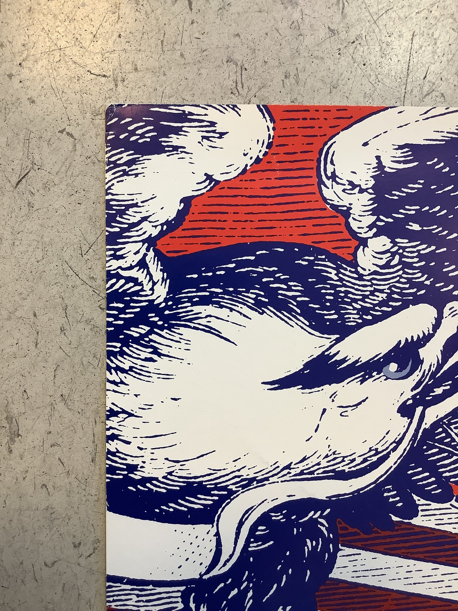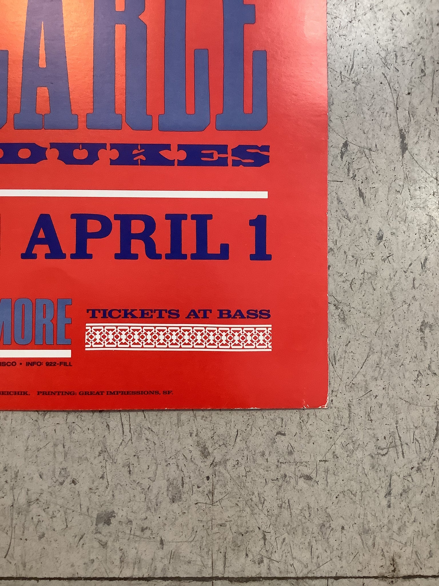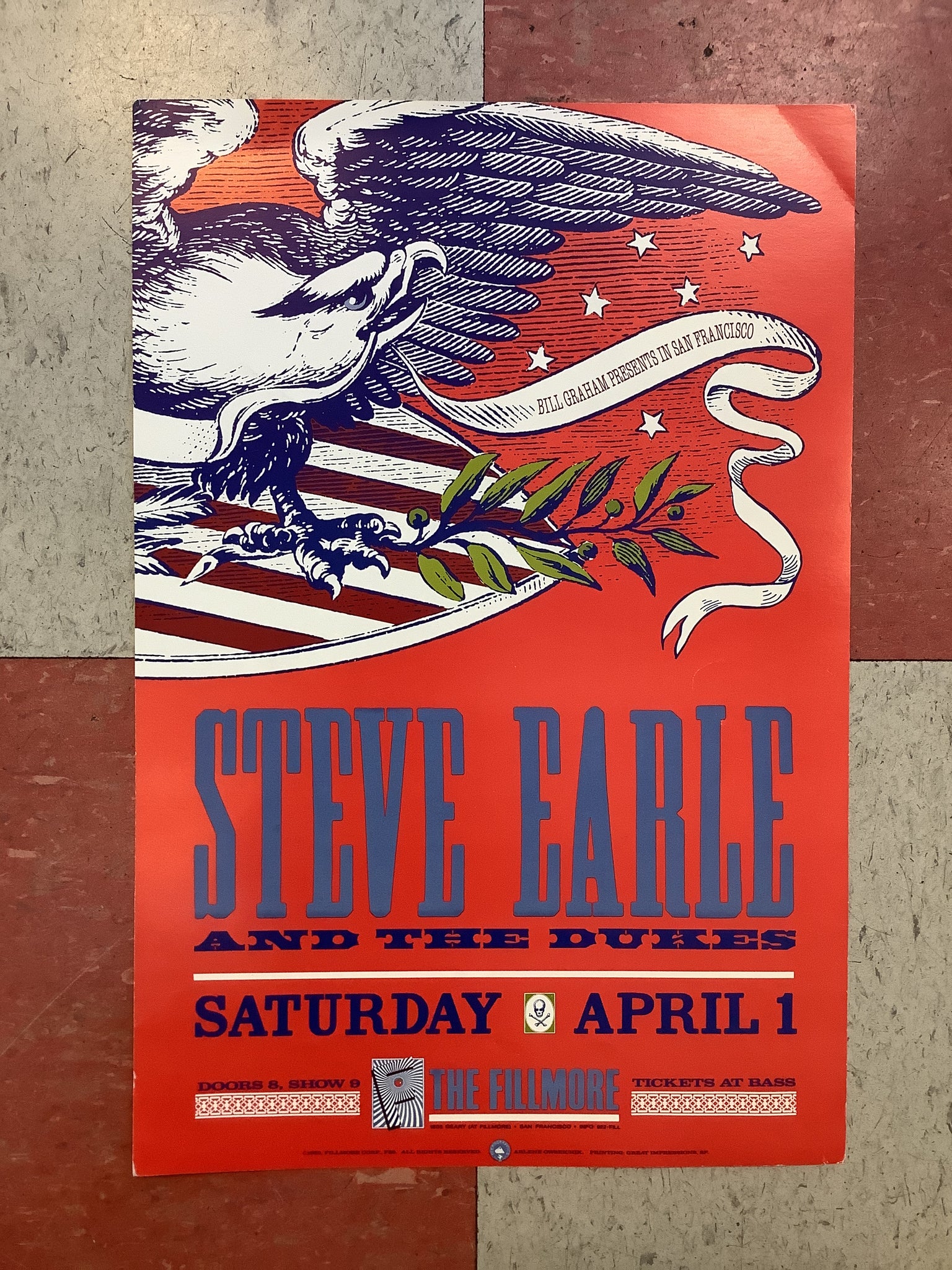 Vintage poster promoting a show with Steve Earle and The Dukes at The Fillmore on April 1st, 1989. Designed by Arlene Owseichik.
