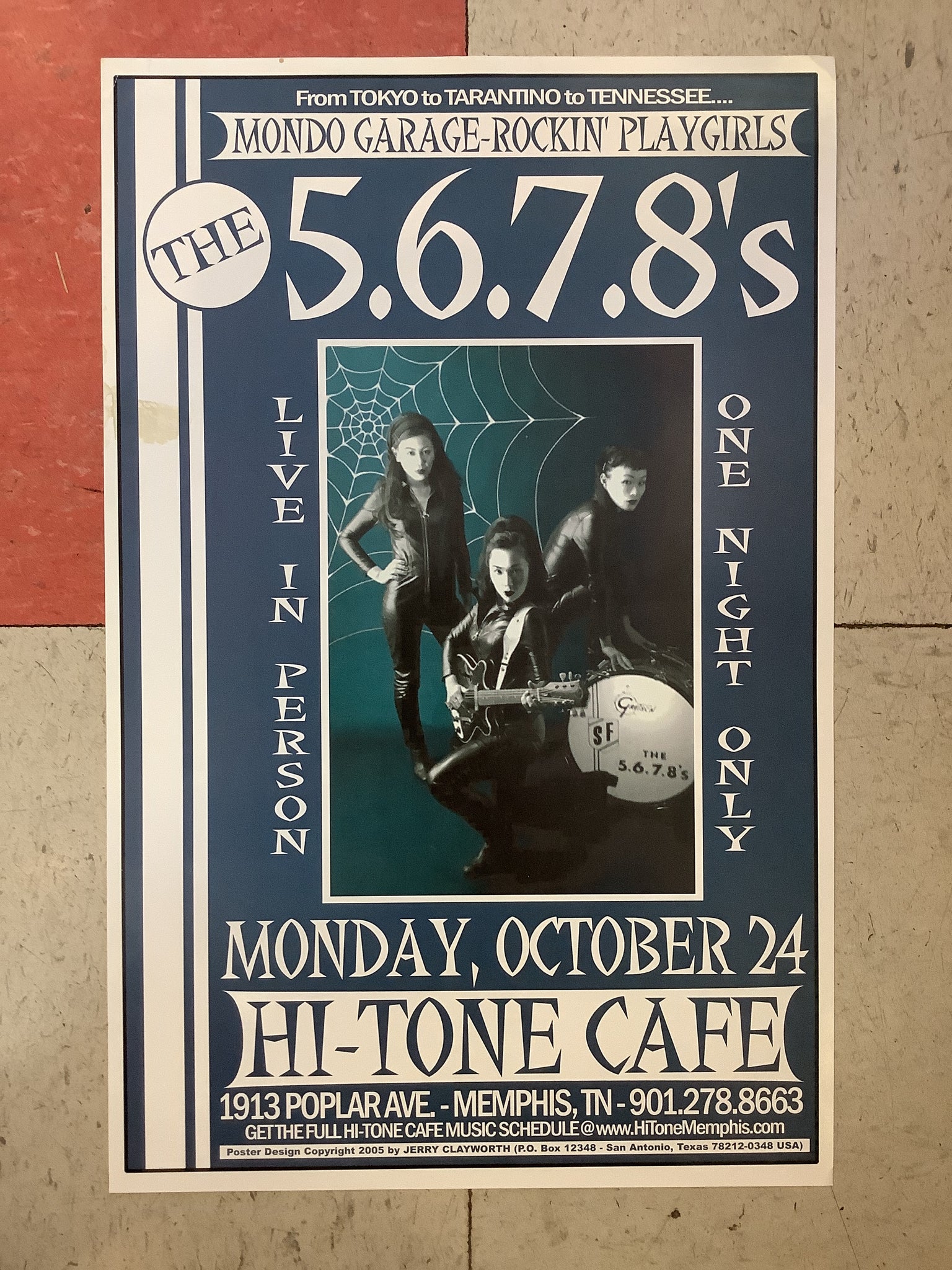 Poster from The 5.6.7.8's show at Hi-Tone Cafe in Memphis, TN on October 24th, 2005. Designed by Jerry Clayworth.