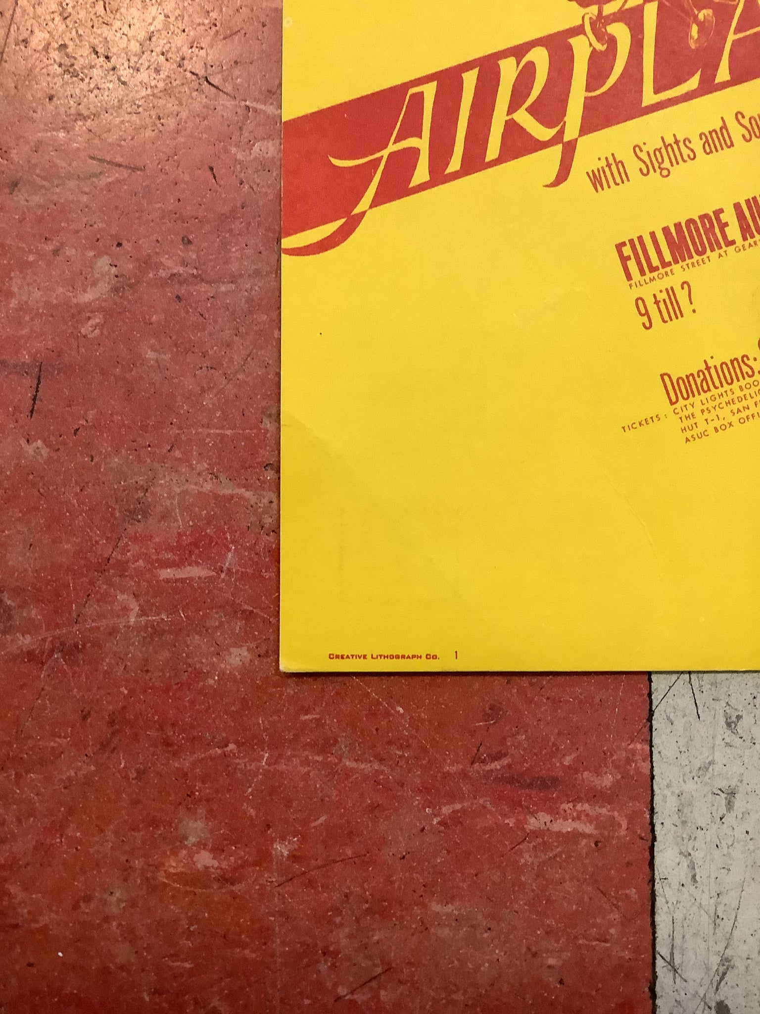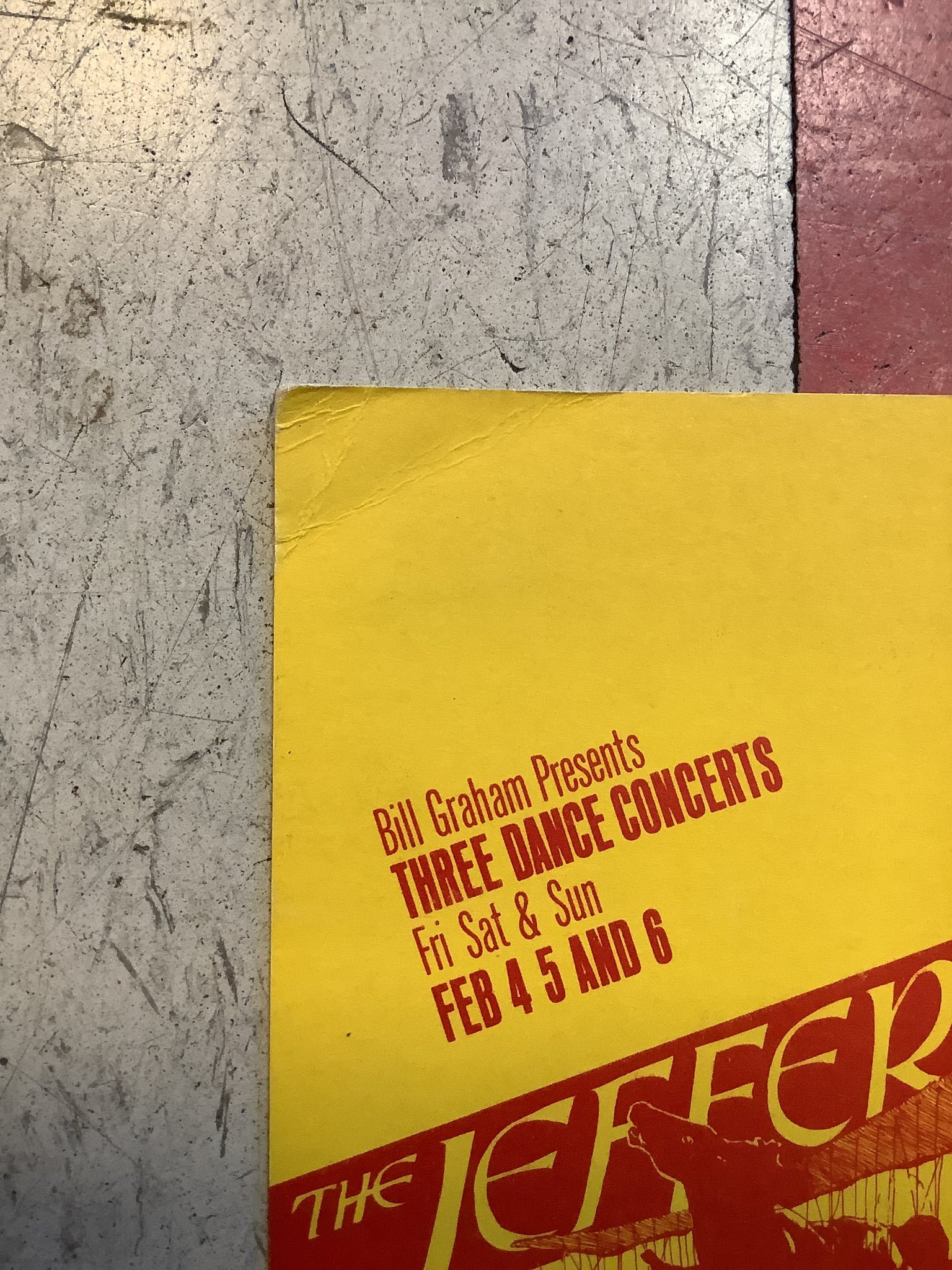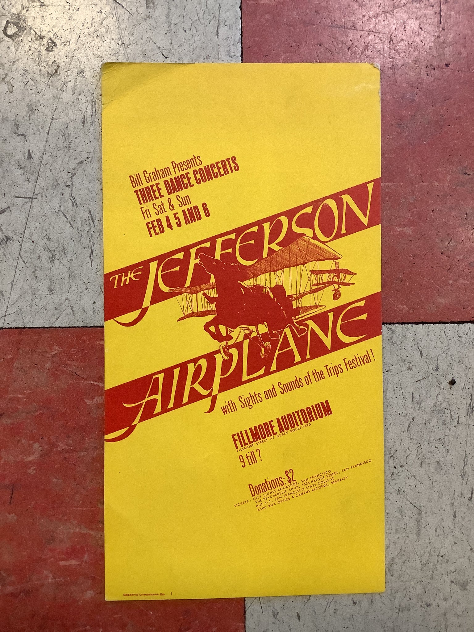 Vintage postcard advertising shows with The Jefferson Airplane at The Fillmore Auditorium on February 4, 5, and 6 in 1966.