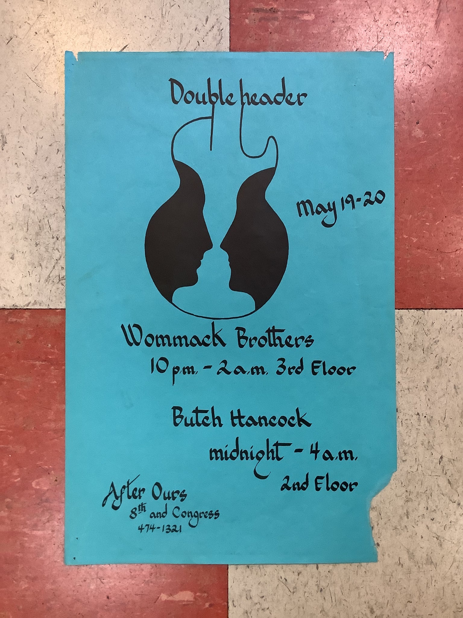 Vintage After Ours poster promoting shows with Wommack Brothers and Butch Hancock. Exact year/poster artist unknown.