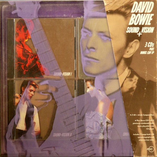 The CDV contains the audio of "Ashes To Ashes" on track 4. Track CD1-1 previously unreleased original demo 1969 Track CD1-2 rare B-side version 1969 Track CD1-3 single version 1970 Track CD1-4 previously unreleased track recorded 1970 Tracks CD1-5 & CD1-6 from 1929 1971 Tracks CD1-7 & CD1-8 from 1718 1971 Track CD1-9 B-side from Ziggy sessions 1971 Track CD1-10 from 1561 1971 Track CD1-11 Aladdin Sane outtake 1973 Tracks CD1-12 & CD1-13 from 2162 1973 Tracks CD1-14 to CD1-16 live from 20155 1973 Tracks CD2-1 to CD2-3 from 22208 1973 Track CD2-4 previously unreleased track recorded 1973 Track CD2-5 from 20141 1974 Track CD2-6 rare single version 1974 Tracks CD2-7 to CD2-9 from 43605 1974 Tracks CD2-10 & CD2-11 from 20174 1975 Track CD2-12 previously unreleased Young Americans outtake 1975 Track CD2-13 previously unreleased track recorded 1975 Tracks CD2-14 & CD2-15 from 22420 1976 Tracks CD3-1 to CD3-3 from 22382 1977 Track CD3-4 german version of "Heroes" (1989 remix) 1977 Tracks CD3-5 & CD3-6 from 22294 1977 Tracks CD3-7 to CD3-9 live from 30403 1978 Tracks CD3-10 to CD3-12 from 22318 1979 Tracks CD3-13 to CD3-15, CDV-Audio4 & CDV-Video from 30425 1980 Tracks CDV-Audio1 to CDV-Audio3 previously unreleased live versions © 1989 Rykodisc ℗ 1969, 1970, 1971, 1972, 1973, 1974, 1975, 1976, 1977, 1978, 1979, 1980, 1983, 1987 Jones Music America / MainMan S A (except "White Light / White Heat", "Ziggy Stardust" and "Rock 'N' Roll Suicide" ℗ 1983 RCA Records. Manufactured under exclusive license from the RCA Records music label of BMG). Manufactured and Marketed by Rykodisc under exclusive license. Manufactured in the USA. 4xCD retrospective box set in an LP sized case; each CD is in a separate jewel case (disc 4 in a slimline case). Contains also a 76-page booklet. On box: "Includes 72-page book with rare photographs and extensive liner notes".