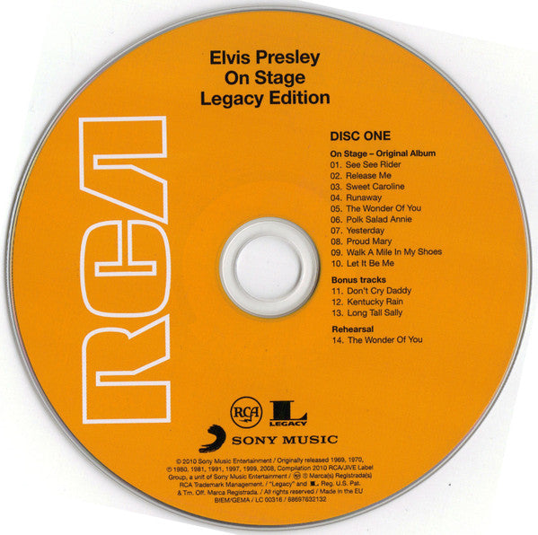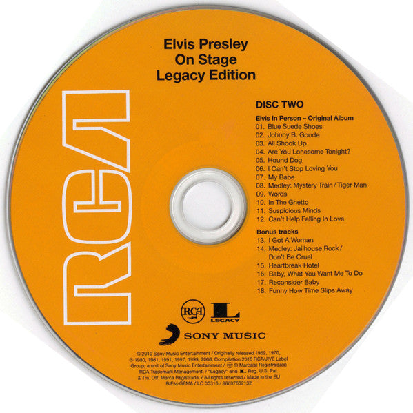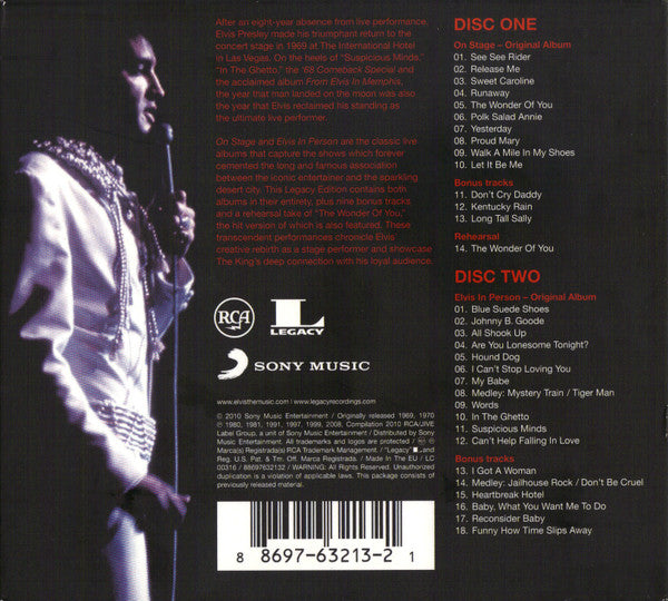 6-panel digipak without Plastic Slip-Case and enclosed 24-page booklet. CD 1 Tracks 1-10: Elvis On Stage, 1970-06-01 CD 2 Tracks 1-12: Elvis In Person, 1969-10-14 All Tracks Recorded Live at The International Hotel, Las Vegas, NV. Bonus Tracks CD 1: 11, 1970-02-18, Dinner Show 12, 1970-02-16, Dinner Show 13, 1970-02-18, Midnight Show 14, 1970-02,18, Afternoon Rehearsal Bonus Tracks CD 2: 13 to 16, 1969-08-23, Dinner Show 17, 1969-08-23, Midnight Show 18, 1969-08-25, Dinner Show