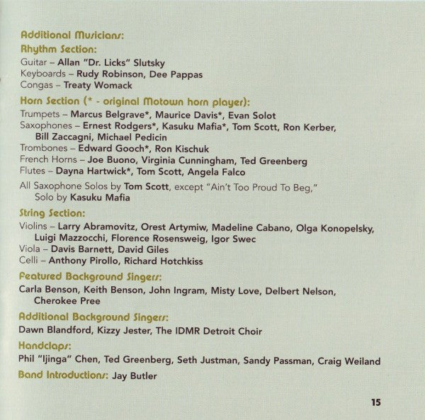Track 1-1 Covering Martha & The Vandellas' original 1963 hit Track 1-2 Covering The Miracles' original 1962/63 hit Track 1-3 Covering The Contours' original 1962 hit Track 1-4 From a combination of the alternate take and the original backing track for The Four Tops' hit recorded at Hitsville, Detroit , summer 1966 Track 1-5 Covering The Four Tops' original 1966 hit Track 1-6 Covering The Temptations' original 1966 hit Track 1-7 Covering Jr. Walker & The All Stars' original 1965 hit Track 1-8 Covering Jimmy Ruffins' original 1966 hit Track 1-9 Covering Marvin Gaye's original 1968 hit Track 1-10 Original track for The Supremes' hit, recorded at Hitsville, Detroit , summer 1966 Track 1-11 Covering The Capitols' original 1966 hit Track 1-12 Covering The Temptations' original 1968 hit Track 1-13 Covering Marvin Gaye's original 1971 hit Track 1-14 Covering Marvin Gaye & Tammi Terrell's original 1967 hit Track 1-15 Recorded January 9 or 10, 1970, first issued on the album [r=2223760, Soul 715, September 1970