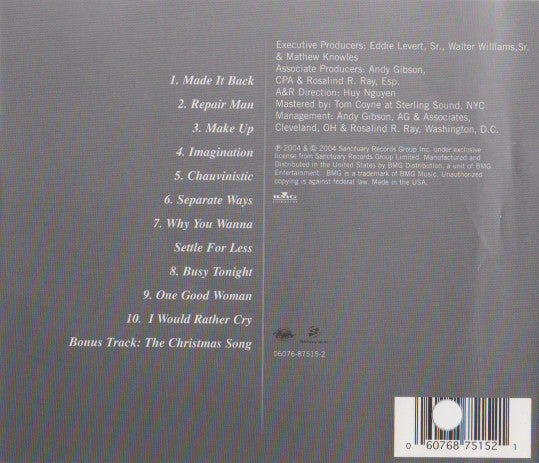Includes 8 pages booklet. Tracks 1, 6 Produced for Songbook Entertainment Engineered at Palace Studio, Cleveland, OH Mixed at Sony Music Studios, NYC Track 2, 9 Produced for Lonte Music Engineered at Palace Studio, Cleveland, OH Mixed at Sony Music Studios, NYC Tracks 3, 5, 8 Produced for WaltEd Publishing Co., Inc. Engineered an mixed at Palace Studio, Cleveland, OH Track 4, 7 Produced for Flyte Tyme Productions Engineered at Flyte Tyme West @ The Village Recorders, Los Angeles Mixed at Flyte Tyme West "The Boom Boom Room" @ The Village Recorders, Los Angeles Track 10 Produced for Trevel Productions Company, Inc. Engineered at Earpaint Studio, Bratenahl, OH Palace Recording Studio, Cleveland, OH Mixed at Pink's Place, Lakewood, OH Bonus track Recorded at Ocean Way Studio, Hollywood, CA Music Grinder Studios, Hollywood, CA Mixed at Music Grinder Studios, Hollywood, CA ℗ © 2004 Sanctuary Records Group Ltd. [On tray card: Made in the USA.