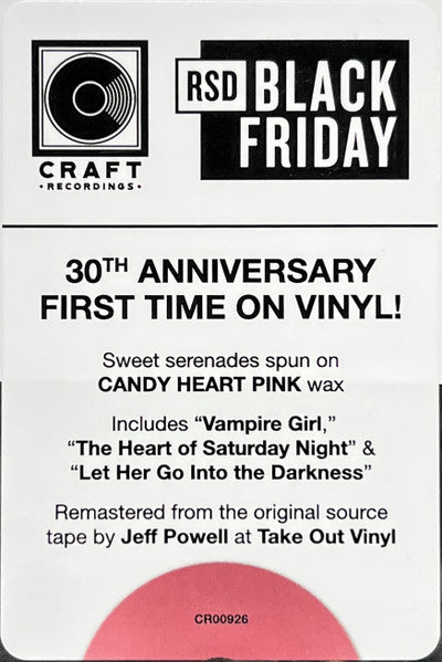 Black Friday "RSD Exclusive" release. The US RSD page for this release states that it was released in a quantity of 1,600 copies. Hype sticker: -30th anniversary -Sweet serenades spun on Candy Heart Pink wax -Remastered from the original source tape by Jeff Powell at Take Out Vinyl "Made in U.S.A." is printed on the back cover.