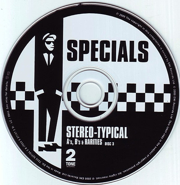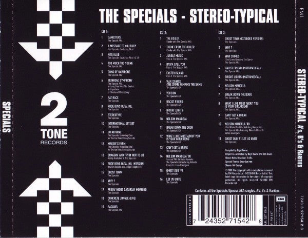Track 1-1 taken from The Special AKA Vs. The Selecter 7". Track 1-2 taken from A Message To You Rudy 7". Track 1-3 taken from A Message To You Rudy 7". Track 1-4 taken from Too Much Too Young EP. Track 1-5 taken from Too Much Too Young EP. Track 1-6 taken from Too Much Too Young EP. Track 1-7 taken from Rat Race 7". Track 1-8 taken from Rat Race 7". Track 1-9 taken from Stereotype 7". Track 1-10 taken from Stereotype 7". Track 1-11 taken from Do Nothing 7". Track 1-12 taken from Do Nothing 7". Track 1-13 taken from Braggin' & Tryin' Not To Lie / Rude Boys Outa Jail 7". Track 1-14 taken from Braggin' & Tryin' Not To Lie / Rude Boys Outa Jail 7". Track 1-15 taken from Ghost Town 7". Track 1-16 taken from Ghost Town 7". Track 1-17 taken from Ghost Town 7" and taken from Ghost Town (Extended Version) 12". Track 1-18 taken from [r=3228325 (Dutch release). Track 1-19 taken from [r=3228325 (Dutch release). Track 2-1 taken from The Boiler 7" and CHS TT 1217 12". Track 2-2 taken from The Boiler 7" and CHS TT 1217 12". Track 2-3 taken from Jungle Music / Rasta Call You 7" and taken from Jungle Music 12". Track 2-4 taken from Jungle Music / Rasta Call You 7" and taken from Jungle Music 12". Track 2-5 taken from Jungle Music 12". Track 2-6 taken from [r=7276700 7" and War Crimes 10". Track 2-7 taken from [r=7276700 7" and War Crimes 10". Track 2-8 taken from Racist Friend / Bright Lights 7" and taken from Racist Friend / Bright Lights 12". Track 2-9 taken from Racist Friend / Bright Lights 7" and taken from Racist Friend / Bright Lights 12". Track 2-10 taken from Nelson Mandela 7". Track 2-11 taken from Nelson Mandela 7". Track 2-12 taken from What I Like Most About You Is Your Girlfriend 7". Track 2-13 taken from What I Like Most About You Is Your Girlfriend 7". Track 2-14 taken from [r=3203534 Special 70 Birthday remake. Track 2-15 taken from Ghost Town Revisited 7". Track 2-16 taken from CHS TT 30. Track 3-1 taken from Ghost Town (Extended Version) 12". Track 3-2 taken from Ghost Town (Extended Version) 12". Track 3-3 taken from War Crimes 10". Track 3-4 taken from Racist Friend / Bright Lights 12". Track 3-5 taken from Racist Friend / Bright Lights 12". Track 3-6 taken from Nelson Mandela 12". Track 3-7 taken from Nelson Mandela 12". Track 3-8 taken from What I Like Most About You Is Your GirlFriend 12". Track 3-9 taken from What I Like Most About You Is Your GirlFriend 12". Track 3-10 taken from Free Nelson Mandela (Special 70th Birthday Remake) 12". Track 3-11 taken from Ghost Town Revisited 12". Printed in the EU. UPC printed in text on disc rim: Disc 1: 7243 5 27154 2 8 (7243 5 27155 2 7) Disc 2: 7243 5 27154 2 8 (7243 5 27156 2 6) Disc 3: 7243 5 27154 2 8 (7243 5 27157 2 5) Contains all The Specials/Special AKA singles, A's, B's & rarities. Packaged in a standard double jewel case with a 16-page booklet. Special thanks: Drew Lorimer.