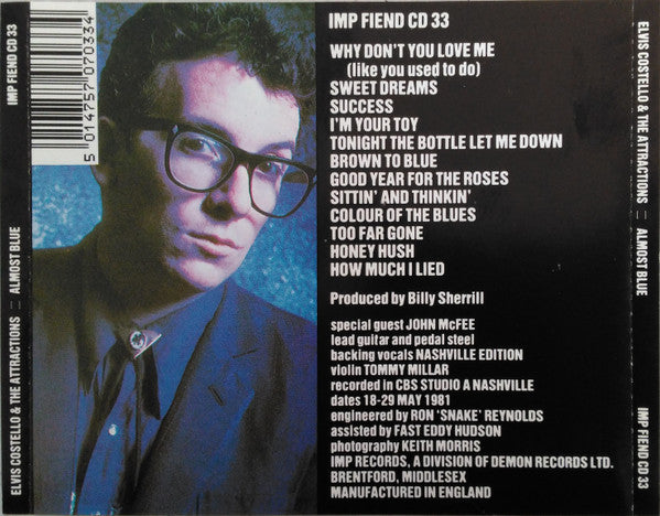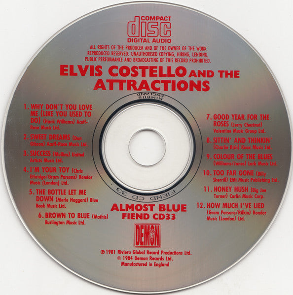 Issued in a standard black tray jewel case with an 8-page booklet, and an additional 8-page booklet titled "The Elvis Costello Collection". Catalogue # IMP FIEND CD 33 on tray inlay, spines and main booklet. Catalogue # FIEND CD33 on disc. Artist name given as "Elvis Costello And The Attractions" on the disc. Track 12 titled "How Much I've Lied" in the booklet and on the disc. Recorded in CBS Studio A, Nashville. Dates 18-29 May 1981. Tracks 1, 2: Acuff-Rose Music Ltd Track 3: United Artists Music Ltd Tracks 4, 12: Rondor Music (London) Ltd Track 5: Blue Book Music Ltd Track 6: Burlington Music Ltd Track 7: Valentine Music Group Ltd Track 8: Knox Music Ltd Track 9: Lark Music Ltd Track 10: EMI Music Publishing Ltd Track 11: Carlin Music Corp Recorded in CBS Studio A Nashville Dates 18-29 May 1981 Manufactured in England ℗ 1981 Riviera Global Record Productions Ltd © 1984 Demon Records Ltd
