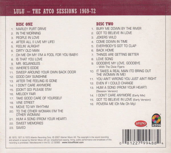 Clear plastic slipcase, containing 3 fold card CD digipack with 2 compartments for the 2 CD's. Also containing 20 page booklet. Tracks 1.01 to 1.11 from "[r=1663669" Atco #33-310 (February 1970) LP's #88. Recorded at Muscle Shoals Sound Studios, Muscle Shoals, AL, September & October 1969. Tracks 1.07 & 1.11 Atco single [r=6975613 #6722 (December 1969); Pop #22. Tracks 1.10 & 1.21 Atco single [r=2898224 #6749 (April 1970). Tracks 1.12 to 1.23 from "[r=2413111" Atco #33-330 (1970). Recorded at Atlantic South-Criteria Studios, Miami, FL, March & May 1970). Tracks 1.12 & 1.13 Atco single #6761 (1970). Tracks 1.16 & 1.20 Atco single [r=6025675 #6774 (1970). Tracks 2.01 to 2.04 & 2.06 to 2.09: Recorded at Criteria Studios, Miami, FL, November 11, 1970. Track 2.01 previously unissued. Track 2.02 Atco [UK Single [r=2171566 #2091-049 (1971). Tracks 2.05 & 2.09 Atco single #6819 (1971). Tracks 2.10 to 2.11 Atco Single [r=5897665 #6885 (1972). Track 2.12 Atlantic [UK Single [r=6275056 #10185 (16 June, 1972). Tracks 2.13 & 2.14 previously unreleased. Track 2.15 recorded at Criteria Studios, Miami, FL, 21. December 1970, previously unissued. Track 2.16 Atlantic [Italy Single #03158 (1970). ℗1970, 1971 & 1972 Atlantic Recording Corp. ©2007 Warner Music UK. Manufactured in the EU.