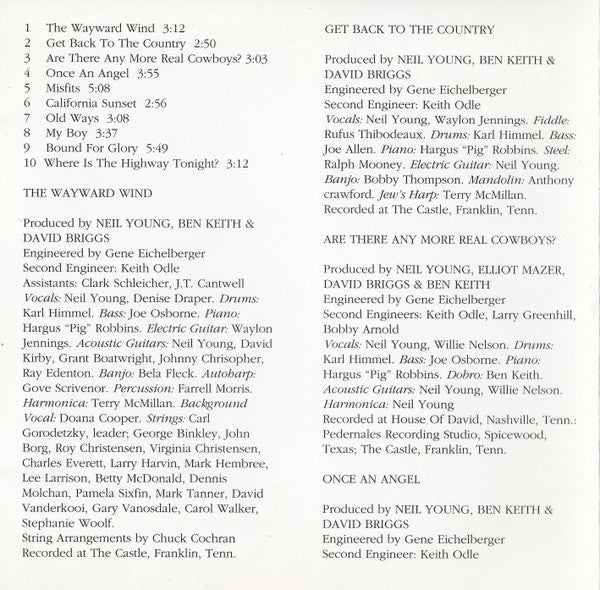 Issued in a standard black tray jewel case with a 6-page folded booklet. Recorded at The Castle, Franklin, Tenn. except; Track 2 recorded at House Of David, Nashville, Tenn.; Pedernales Recording Studio, Spicewood, Texas,; The Castle, Franklin, Tenn Track 6 recorded at Austin City Limits, Austin, Texas Track 8 recorded at House Of David, Nashville, Tenn. Mixed at Redwood Digital, Woodside, Calif. Originally mastered for Woodland Mastering, Nashville, Tenn. Back cover: ℗ & © 1985 The David Geffen Company, an MCA Company Printed in Germany Booklet: © 1985 The David Geffen Company, an MCA Company Disc: ℗ 1985 Geffen Records, Inc., an MCA Company Made in France