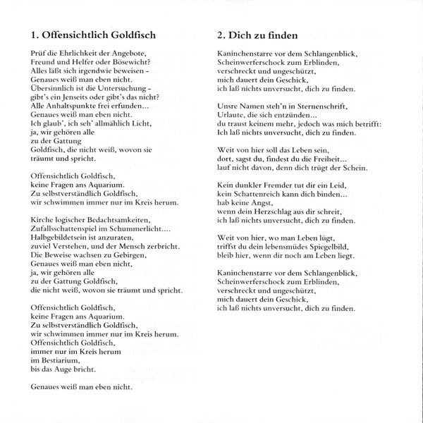 Recorded at Sofa Sound, Crescent Studios and Terra Incognita between 1988 and 1993; Vocals recorded at Madagaskar Studios, Hannover and Terra Incognita, Bath in July 1993; Mixed at Terra Incognita, July 1993; Lyrics By [Translation To German - Heinz Rudolf Kunze ******************************************** Songs / Tracks Listing 1. Offensichtlich Goldfisch (4:59) Evidently Goldfish (Out of Water, 1990) 2. Dich zu finden* (4:42) I Will Find You (Fireships, 1992) 3. Die Kälte killt den Kuß (4:08) A Kick to Kill the Kiss (The Noise, 1992) 4. Favorit* (5:02) His Best Girl (Fireships, 1992) 5. Kaufhaus Europa (5:06) The Great European Department Store (The Noise, 1992) 6. Der Lärm (6:11) The Noise (The Noise, 1992) 7. Oase* (5:40) Oasis (Fireships, 1992) 8. Die Prominenz küßt sich (4:31) Celebrity Kissing (The Noise, 1992) 9. Die Tinte verlischt (4:19) Invisible Ink (In A Foreign Town, 1988) 10. Auto (Wieder im Wagen) (3:55) Auto (In A Foreign Town, 1988) 11. Gaia* (5:35) Gaia (Fireships, 1992) 12. Schlaft nun (4:36) Sleep Now (And Close As This, 1986)
