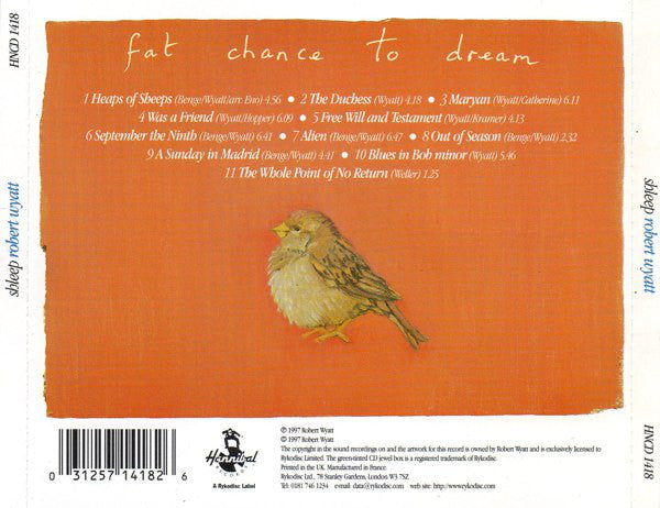 Has a green-tinted jewel box. ℗ 1997 Robert Wyatt. © 1997 Robert Wyatt. The copyright in the sound recordings on and the artwork for this record is owned by Robert Wyatt and is exclusively licensed to Rykodisc Limited. The green-tinted CD jewel box is a registered trademark of Rykodisc. Printed in the UK. Manufactured in France. Rykodisc Ltd., 78 Stanley Gardens, London W3 7SZ Tel: 0181 746 1234 email:data@rykodisc.com web site: Recorded at Phil Manzanera's studio during the autumn, winter and spring of 1996-97; except track 3: voice and violin recorded at the Chapel Studio, S.Thoresby - guitar recorded in Belgium, at the Moon Office, as part of a project for producer Jo Bogaert. Track 4 - Intro: sample from [r=1647102 by the very astute Austrian group, [a263409, on EV003. Publishing copyright: Track 1 MCPS/Opal Music Tracks 2, 4 to 10 MCPS Track 3 MCPS/Nairam Music Track 11 Paul Weller/EMI Music Publishing Ltd. Issued in a clear tray jewel case including a 16-page booklet with lyrics, credits and liner notes by Robert Wyatt.