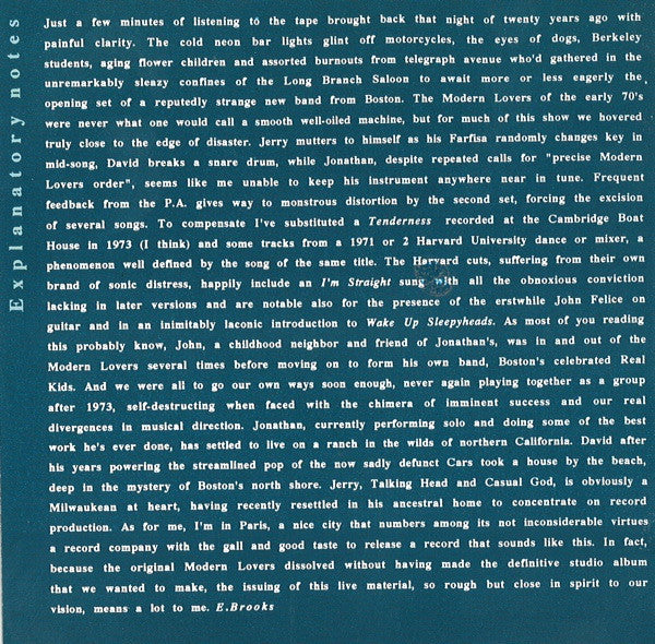 Comes with a 12-page booklet incl. lyrics. (p) 1992 Modern Lovers (c) 1992 Fan Club records 3 tracks not on [r=2074876. 1 to 10 recorded at "Long Branch Saloon", Brooklyn Berkeley California, April 1973. 11 recorded at Cambridge Mass. 1973. 12 to 16 recorded at Harvard University, Cambridge Mass. 1971 or 72.