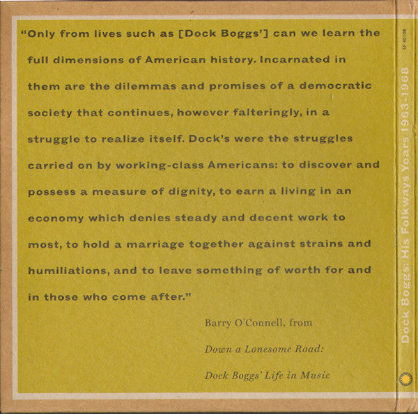 CD reissue of three Folkways LPs: "Dock Boggs, Legendary Singer & Banjo Player" (1963), "Dock Boggs, Volume 2" (1965), "Dock Boggs, Volume 3" (1970).