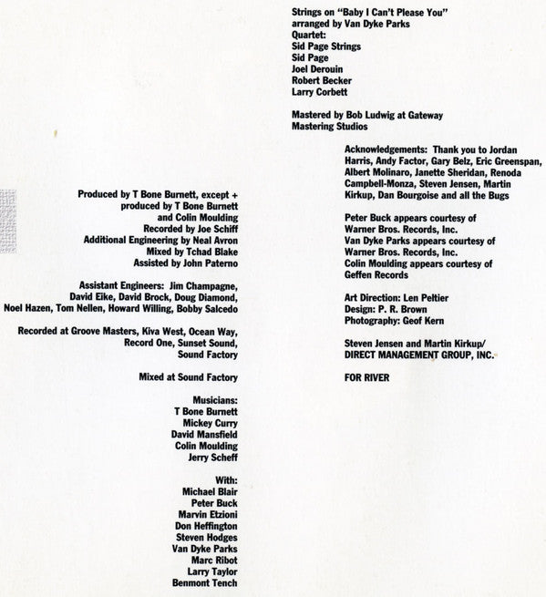 Guest artists: T. Bone Burnett, Mickey Curry, David Mansfield, Colin Moulding, Jerry Scheff, Michael Blair, Marvin Etzioni, Don Heffington, Steven Hodges, Van Dyke Parks, Larry Taylor, Benmont Tench, Sid Page Strings. Recorded and mixed at Sound Factory