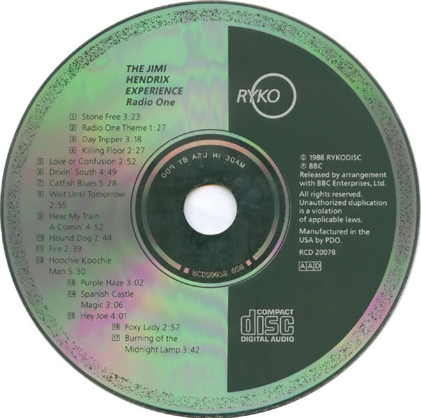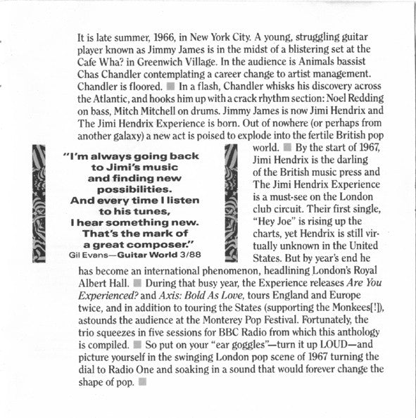 Released in a standard jewel box with 8 page booklet. Back Cover and booklet: Printed in Canada. CD: Manufactured in the USA by PDO. All tracks Bella Godiva Music BMI, except 3: Maclen Music, BMI 4: ARC Music Corp., BMI 6: PPX Publishing, BMI 7: Watertoons Music, BMI 10: Elvis Presley Music/Duchess Music, BMI 12: Willie Dixon SP. a/c Bug Music, BMI 15: Third Story Music, BMI ============================== Additional Credits: Source In Session Tonight - The Complete Radio 1 Recordings by Ken Garner Producers, Engineers & Lead Vocals track 3 + Track 1, 5, 15, 16 First Broadcast: 18th February 1967 Recorded: 13th February 1967 Program: BBC Light Program - Saturday Club Studio: Studio 2, Sub-basement, Broadcasting House Tracks: 4, 11, 13 First Broadcast: 1st April 1967 Recorded: 28th March 1967 Program: BBC Light Program - Saturday Club Studio: Studio 2, Sub-basement, Broadcasting House Tracks: 7, 10, 17 Track: 6 (this was the second take of Driving South and was not actually broadcast) First Broadcast: 15th October 1967 Recorded: 6th October 1967 Program: BBC Radio One - Top Gear Studio: Playhouse Theatre, Northumberland Avenue Tracks: 12 First Broadcast: 13th November 1967 Recorded: 17th October 1967 Program: BBC World Service - R&B Studio: Aeolian Hall, Studio 2 Tracks: 2, 3, 9, 8, 14 First Broadcast: 24th December 1967 Recorded: 15th December 1967 Program: BBC Radio One - Top Gear Studio: Playhouse Theatre, Northumberland Avenue 3 sessions are not actually from Radio One (Source: Harry Shapiro - Electric Gypsy). Catfish Blues was entitled Experiencing The Blues for the session. Hear My Train A Comin was entitled Getting My Heart Back Together Again for the session.