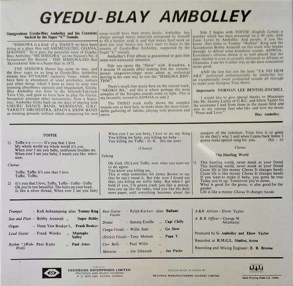 Cover, side labels and credits as on the original release released in 1975 by Essibon/Dix #cat. "EBL 6133. Copyright [P 1975 In the back cover artists accredited as: - Ralph Karikari alias Ballami - Tony Mensah alias Papa T. - Willie Sam alias [a3355798 - Sammy Essilfie alias Capi Chilly - Frank Wireko alias Mustapha Salley - Joe Ghansah alias Joe Pache - Nana Yaw Boakye I alias [a1628146 - Paul Kumi alias Paul Jones - Bobby Asiamah alias Super Bobby - Kofi Acheampong alias [a1364495