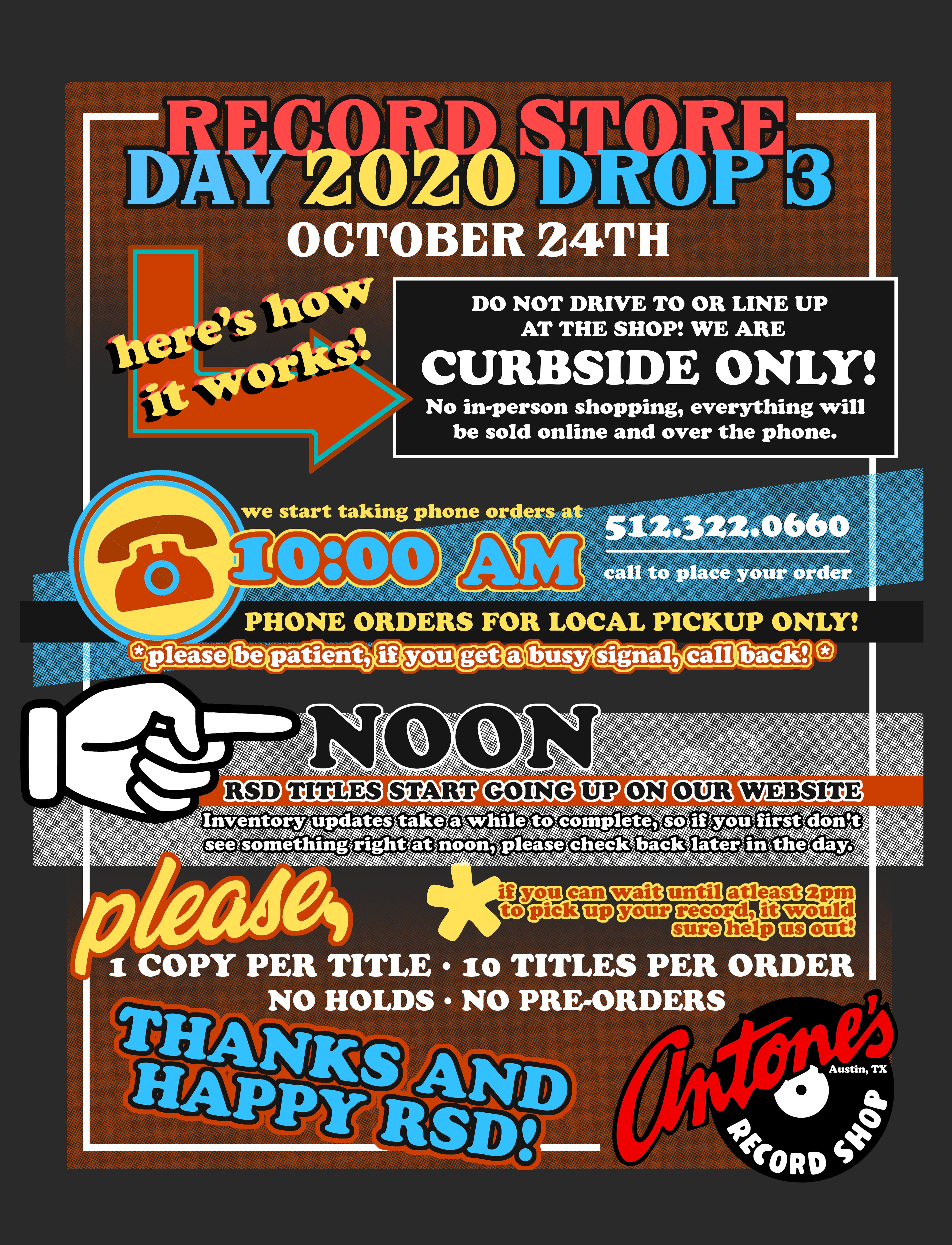 Here's the plan for RSD Drop #1 on Saturday, June 12, 2021. No phone orders this time. In person shopping only with online orders later in the day...