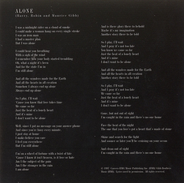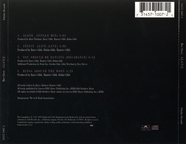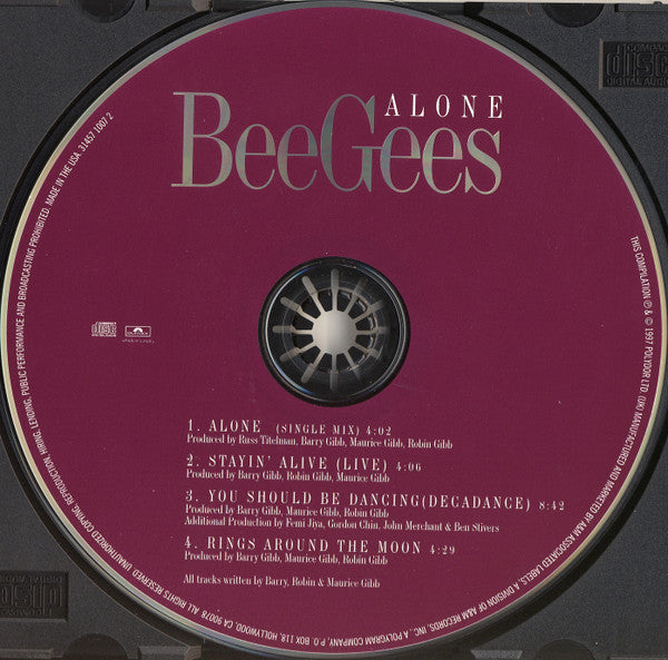 Also includes the previously unreleased tracks: Stayin' Alive (Live), You Should Be Dancing (Decadance), Rings Around The Moon. Also issued with an outer black and white glossy sticker detailing the info above.