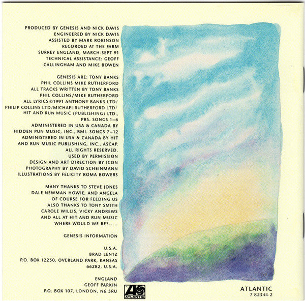 Released in jewel case included 16-page booklet with credits and lyrics in English. Officially no duration info on release. Recorded at The Farm Surrey England, March-Sept 91 ℗ & © 1991 Anthony Banks Ltd., Philip Collins Ltd., Michael Rutherford Ltd. Made in the U.S.A. All songs published by Anthony Banks Ltd / Philip Collins Ltd / Michael Rutherford Ltd / Hit And Run Music (Publishing) Ltd., PRS. Songs 1-6 administered in USA & Canada by Hidden Pun Music, Inc., BMI. Songs 7-12 administered in USA & Canada by Hit & Run Music Publishing, Inc., ASCAP.