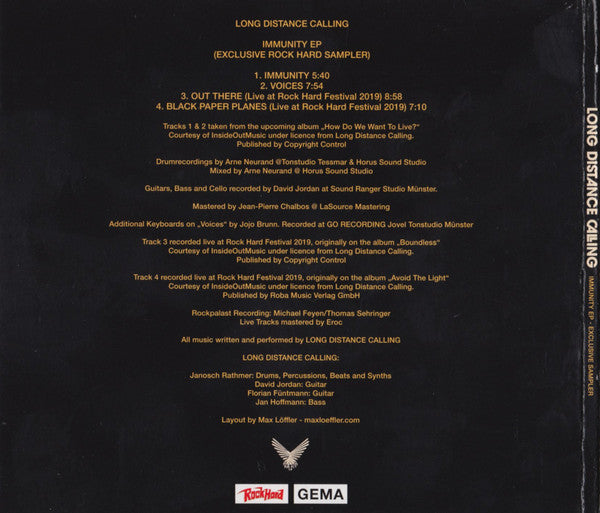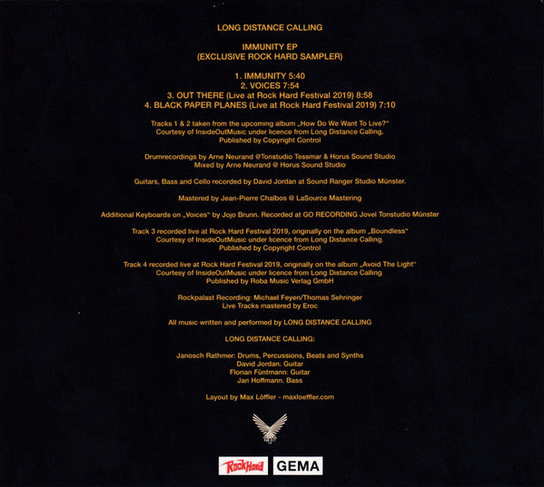 Issued in a 4-panel Digifile. Given away for free with German magazine "RockHard" issue 07/08/2020. Exclusive Rock Hard sampler. Tracks 1 & 2 taken from the upoming album "How Do We Want To Live?". Courtesy of InsideOutMusic under license from Long Distance Calling. Published by Copyright Control. Drumrecordings [... @ Tonstudio Tessmar & Horus Sound Studio. Mixed [.. Horus Sound Studio. Guitars, bass and cello recorded [... at Sound Ranger Studio Münster. Mastered [... @ LaSource Mastering. Additional Keyboards on "Voices" [... recorded at "GO RECORDING Jovel Tonstudio Münster". Track 3 recorded live at the Rock Hard Festival 2019, originally on the album "Boundless". Courtesy of InsideOutMusic under license from Long Distance Calling. Published by Copyright Control. Track 4 recorded live at the Rock Hard Festival 2019, originally on the album "Avoid The Light". Courtesy of InsideOutMusic under license from Long Distance Calling. Published by Roba Music Verlag GmbH.