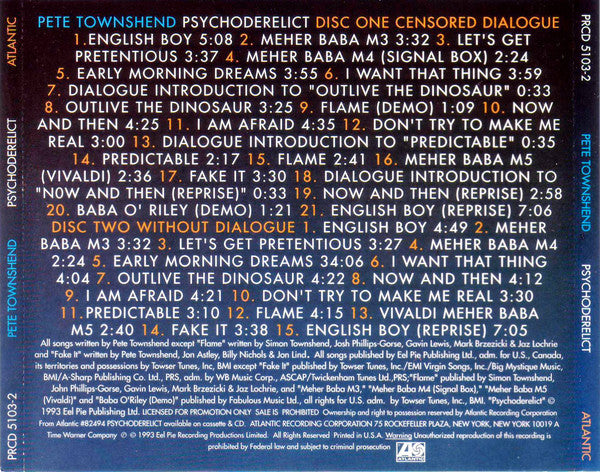 2 CD Set Special Radio Edit Licensed For Promotion Only Sale Is Prohibited Track 2-5 duration is incorrectly listed on the back cover inlay as 34:06. Issued in slim double jewel case, with single sheet insert. All songs published by Eel Pie Publishing Ltd., adm. for U.S., Canada, its territories and possessions by Towser Tunes, Inc, BMI except 1-17, 2-14 published by Towser Tunes, Inc./EMI Virgin Songs, Inc./Big Mystique Music, BMI/A-Sharp Publishing Co. Ltd., PRS, adm. by WB Music Corp., ASCAP/Twickenham Tunes Ltd., PRS; 1-15, 2-12 published by Simon Townshend, John Phillips-Gorse, Gavin Lewis, Mark Brzezicki & Jaz Lochrie, and 1-2, 1-4, 1-16, 1-20, 2-2, 2-4, 2-13 published by Fabulous Music Ltd., all rights for U.S. adm. by Towser Tunes, Inc., BMI. © 1993 Eel Pie Publishing Ltd. Licensed For Promotion Only Sale Is Prohibited Ownership and right to possession reserved by Atlantic Recording Corporation From Atlantic #82494 [r=958530 Atlantic Recording Corporation, A Time Warner Company ℗ © 1993 Eel Pie Recording Productions Limited Printed in U.S.A. Title appears as "Psychoderelict" on on spines, back tray.